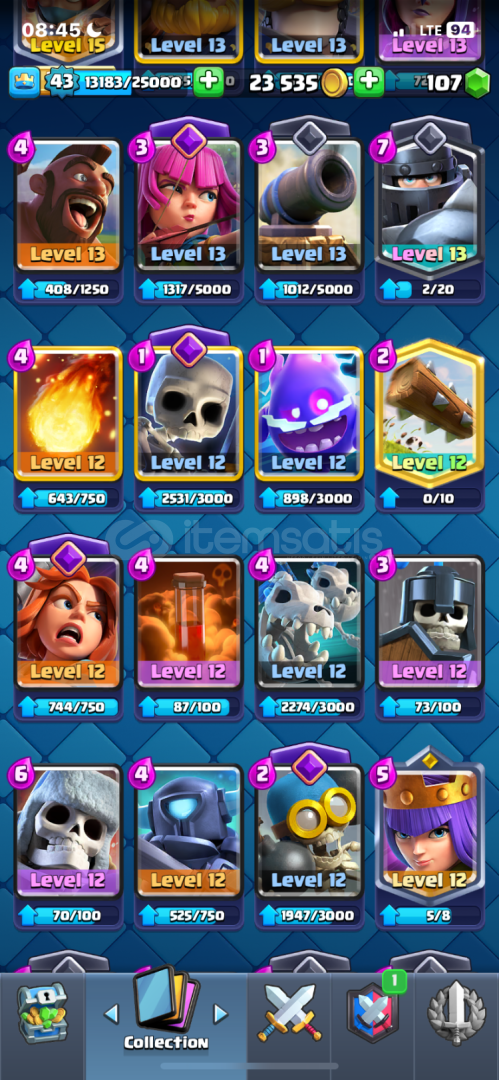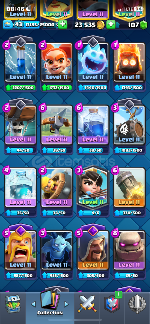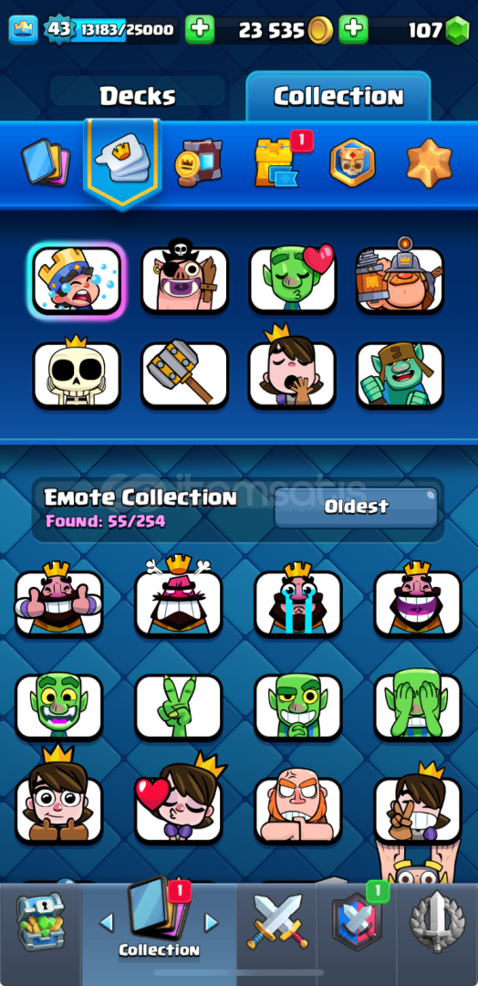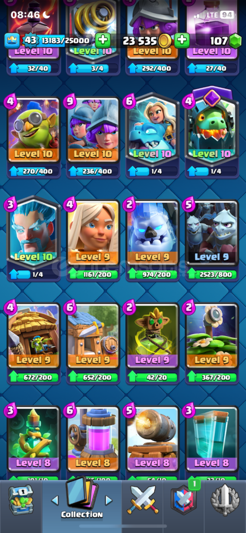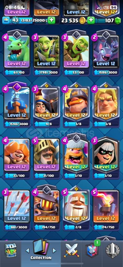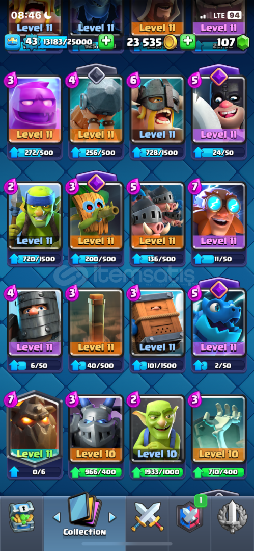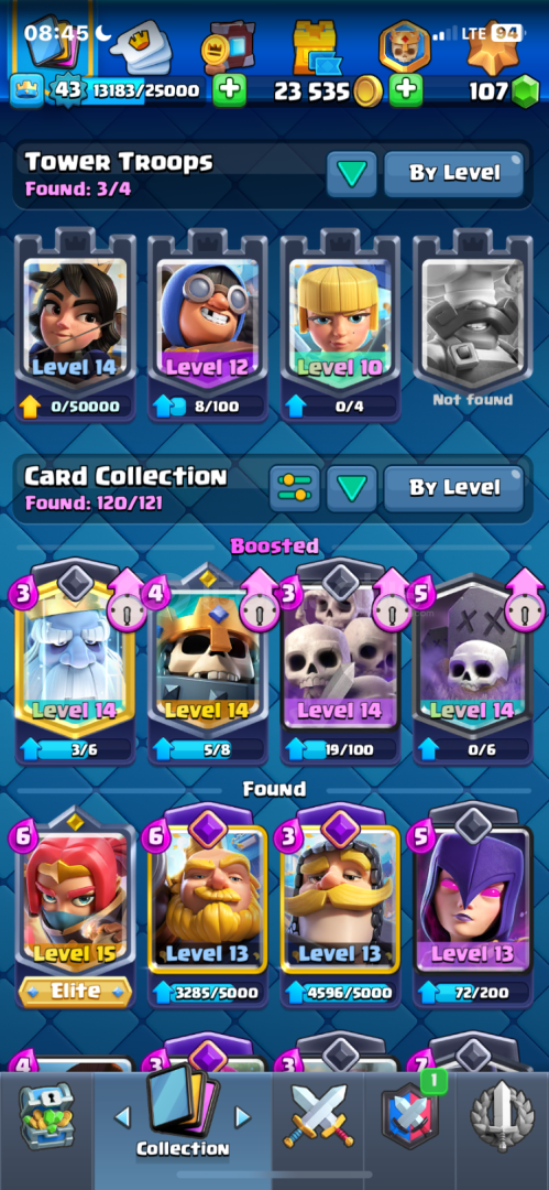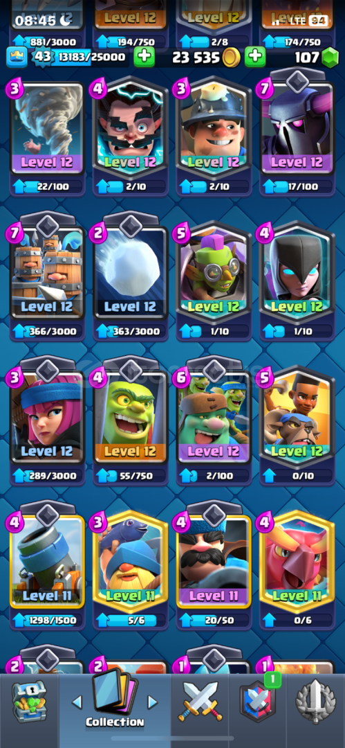 120 tane kart acıktır sadece goblinstein yok 43 level 55 tanede emoji vardır 11 tanede evrim vardır( kraliyet devi şövalye iskelet okçular valkür bombacı tesla büyücü cellat elektro ejder cehennem ejderhası)