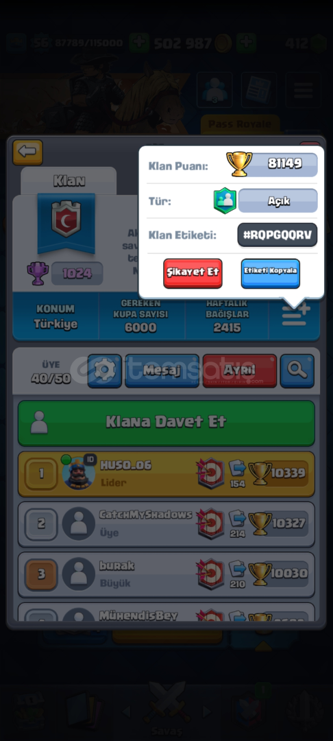 Elit seviye clash royale hesabı. Tüm kartlar açık ve minimum 10 seviye.Pek çok kart +13 seviye. Ligde Büyük şampiyon derecesi. 10000 kupa. 3 kez pass royale alındı hesaba harcanan toplam para 1500 tl. Türk Birliği #RQPGQQRV klanı kurucusu ve lideri olan hesap şiderlikle beraber devredilir. 117 farklı emoji 75 er tane flama ve çerçevesi var. 9 farklı kule görünümü ile koleksiyoncu...