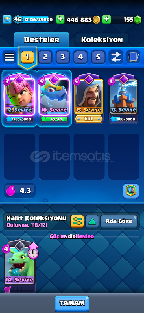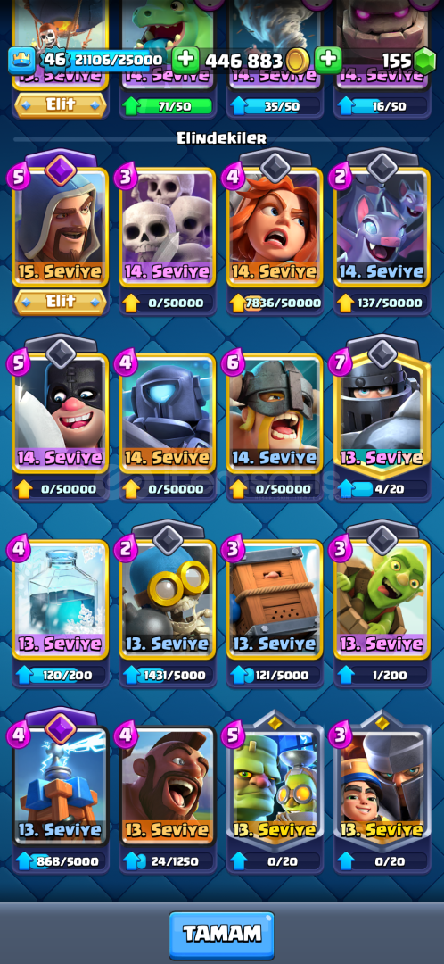 Arkadaşlar zamanında bu hesapı 800- 1000 TL'ye isteyen arkadaşlarım oldu vermedim şimdi çok fazla paraya ihtiyacım var bir lira olsa dahi çok lazım kısa süre içerisinde o yüzden satıyorum ki satmak istemem asla 5 yıllık hesapım fazla ve kısa sürede paraya ihtiyacım olduğu için 660 TL'ye satacağım güzel hesap 8600 kupa 4 Evrim var şampiyon yükseltme kartları 450 TL 180 elmas oldu hesapta 155 görünüyor fotoğraflarda da var