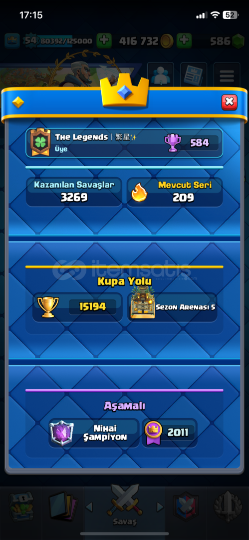 55 deneyim 5 kez nihai olundu 16000 kupa olundu Türkiye 275. Dünya 4041. Olundu 2.6 binici destesi Max ve çoğu şey 14 seviye