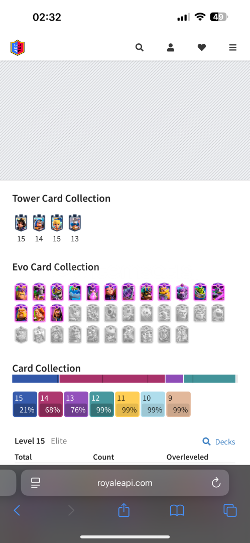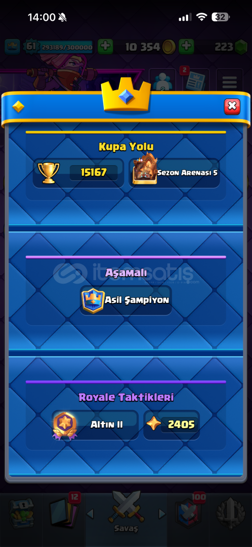 Hesap anlık olarak 61 levelin ucunda 222 taş 10 k altın kartlar: 31 elit seviye kart 59 tane 14 gerisi 13 12 levelKule birlikleri: Elit Prenses +düşeş 14 topçu 13 aşçı153 emot 16 kule görünümü 96 flamaAnlık olarak Nihai şampionda olup 15000 kupa ve 2400 de yeni modda Rranenin klanında aktif olarak yer almakta