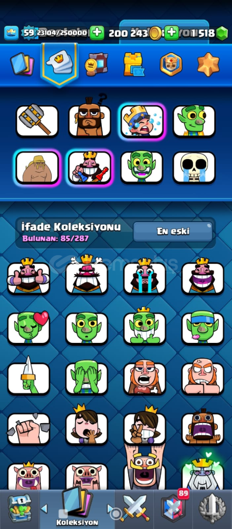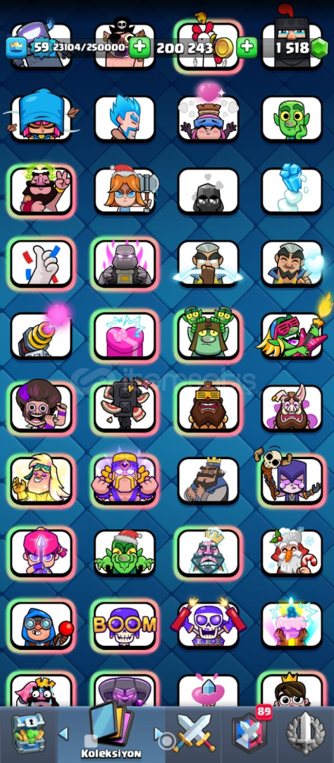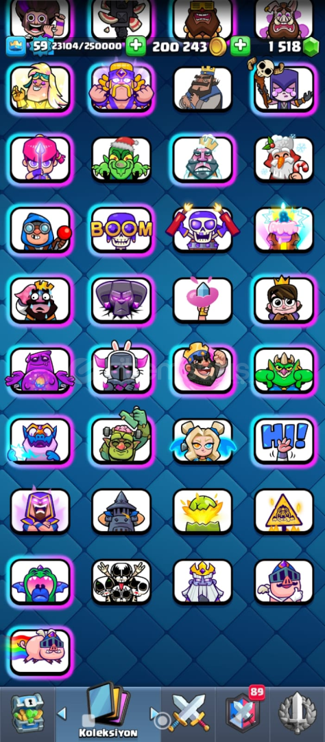 59 lVL 9 YILLIK HESAP 21 elit kart 30 tane 14 lvl max kart 17 evrim fuul dolu joker kartlar 2 sıradan 1 destansı 1 efsanefi kitap kupa 13500 ligde 4 de güncel pass açık çogu emoji flama açık