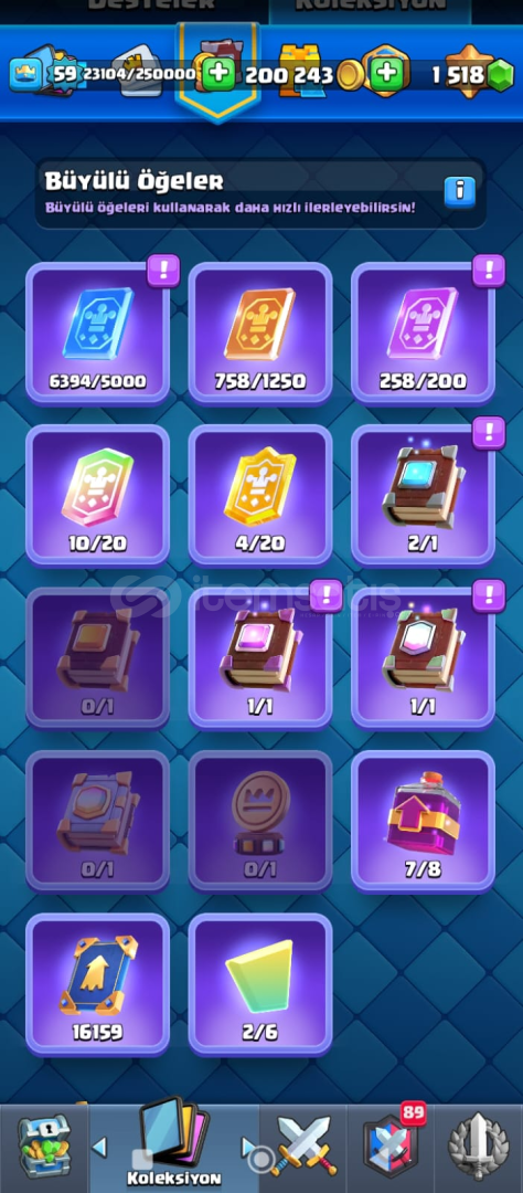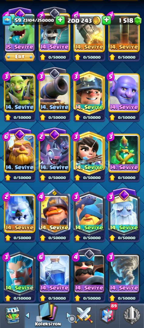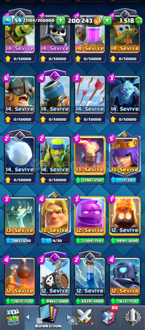 59 lVL 9 YILLIK HESAP 21 elit kart 30 tane 14 lvl max kart 17 evrim fuul dolu joker kartlar 2 sıradan 1 destansı 1 efsanefi kitap kupa 13500...