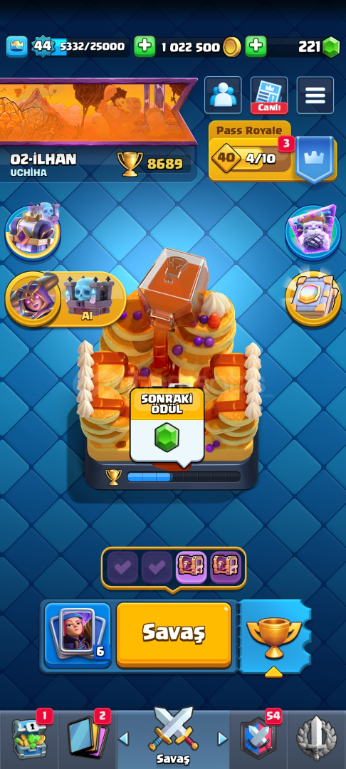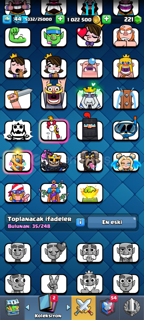 Hesapta iki tane kart eksik 1 şampiyon 1 efsanevi eksik 8 tane Evrim var evrimi yarım kalan kartlarda var hesap seviyem 44 1m para var i&cce...