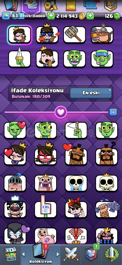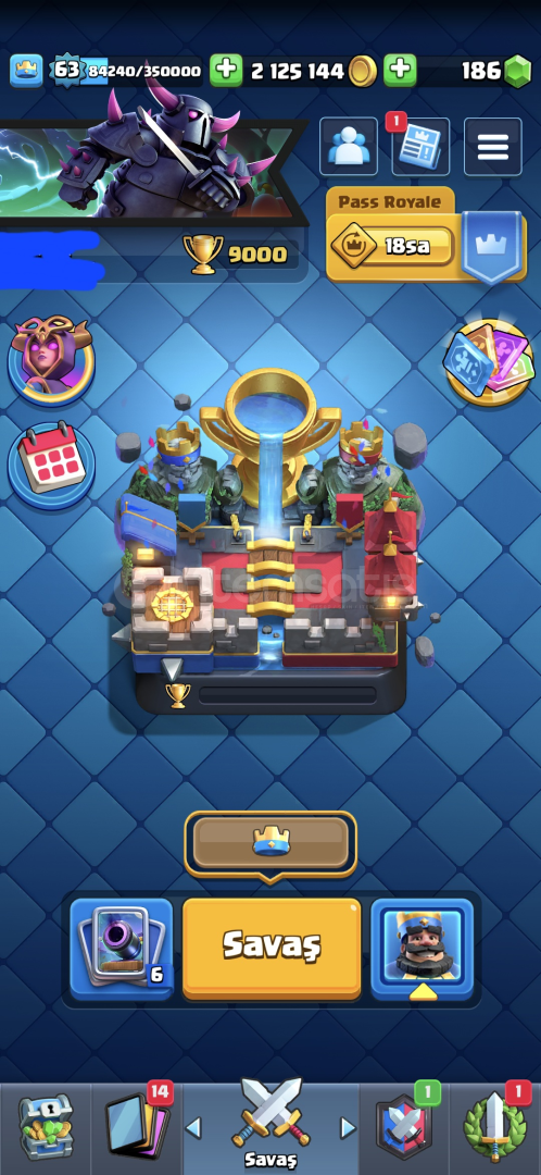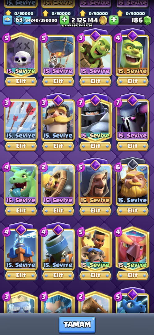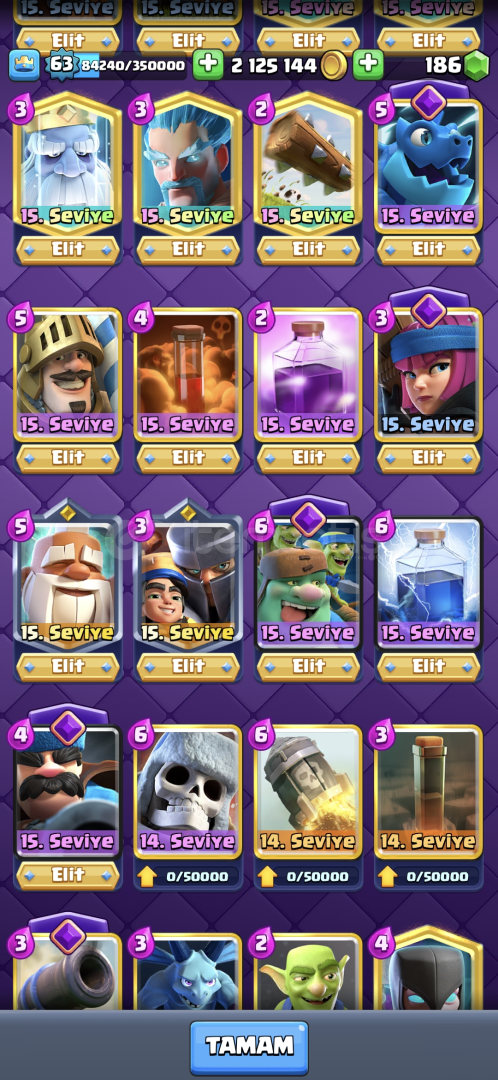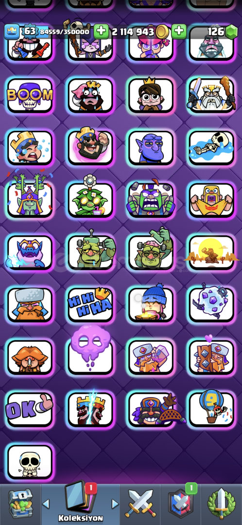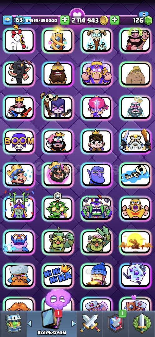 63 seviye clash royale hesap❗️9000 kupa ❗️36 elit kart ❗️Bütün kule birlikleri max❗️109 kart 14 seviye❗️21 tane evrim açık❗️180 emoji❗️