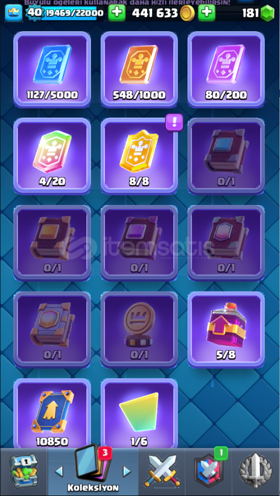 Hesabımız 8200 kupadır.440.000 altınhesap 6 yılıktır BÜYÜLÜ ÖĞELER1127 sıradan joker kart548 ender joker kart80 destansı joker kart4 efsanevi joker kart Daha Fazla Bilgi İçin Mesaj Atmanız Yeterli8 şampiyon joker kart5 adet güçlendirme iksiri10.000 joker parça1 adet evrim parçasıEVRİMLER RESİMDEKİ GİBİDİR. NEDEN BİZİ TERCİH ETMEL&...