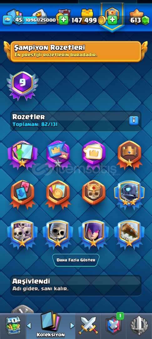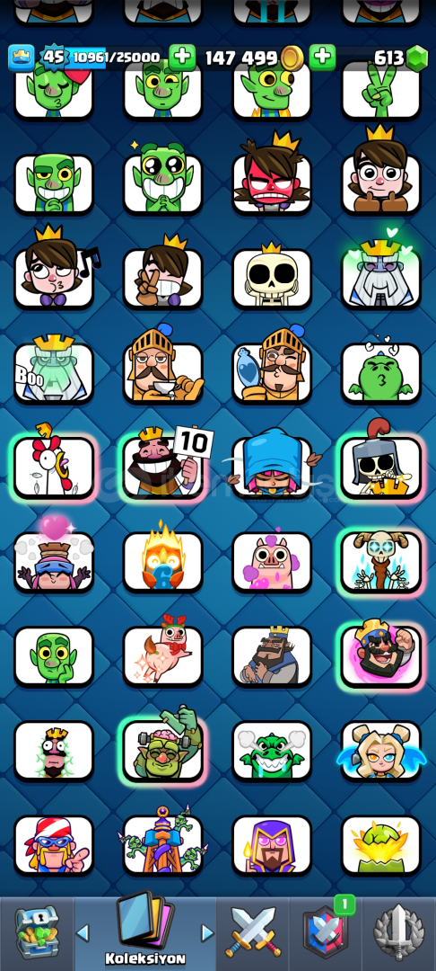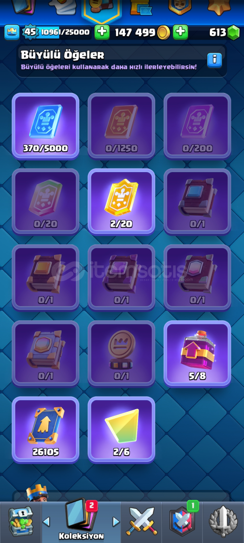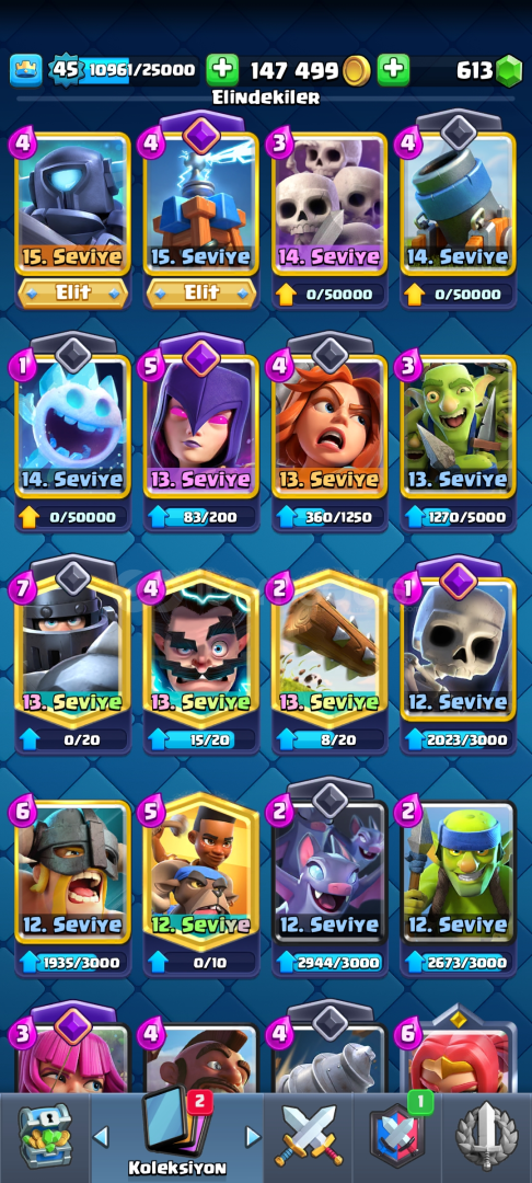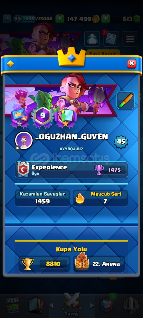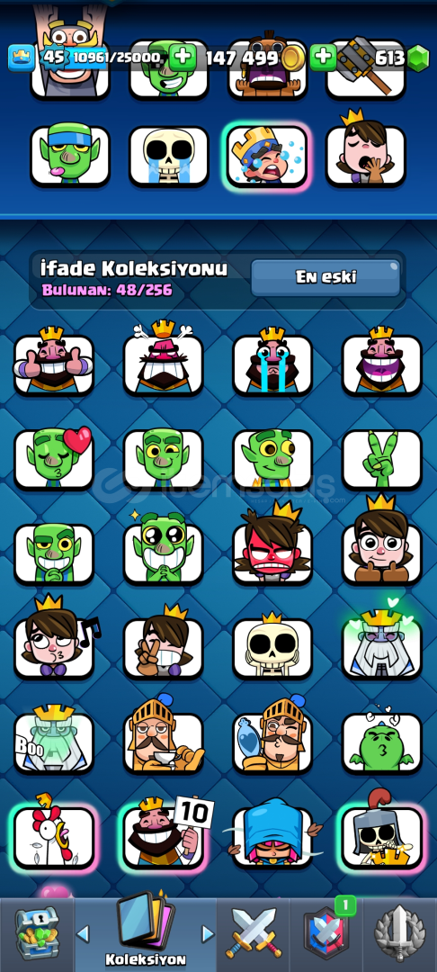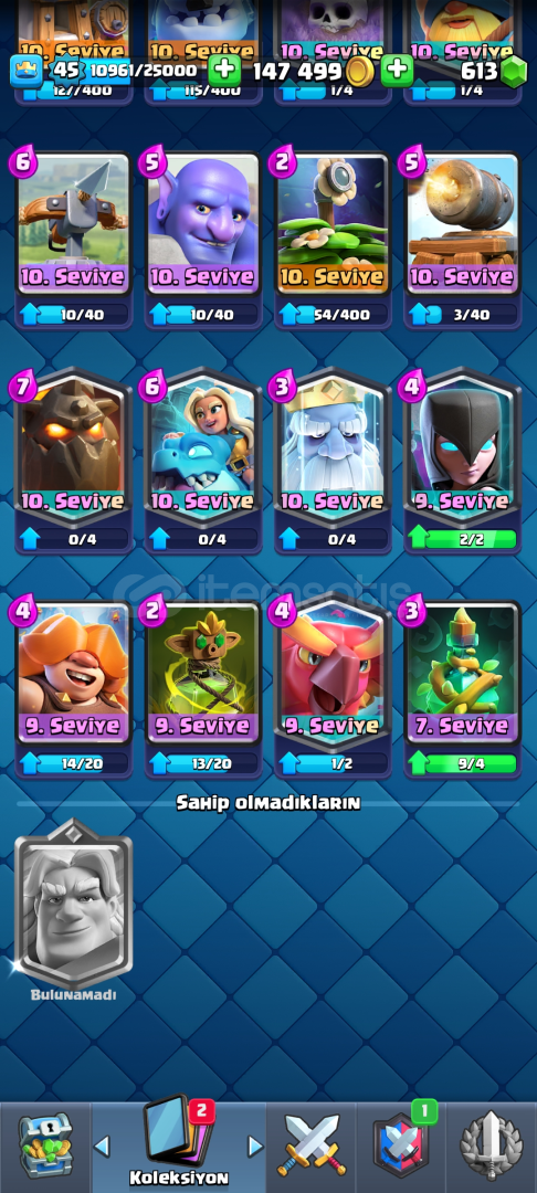 Oyunu saliyorum artık oynayacak vaktim yok hesapta tüm kartlar vardır sadece altın şövalye eksik 45 FOTOĞRAFLARA BAKİNİZ 600 taş vardır hesapta ve içinde 7 evrim vardır(8 de olabilir şuan hatırlamıyorum onu çekmeyi unuttum) isterseniz ig'danda(erenssr3) yazabilirsiniz numaramı veririm konuşuruz. 9000 Bin Kupa