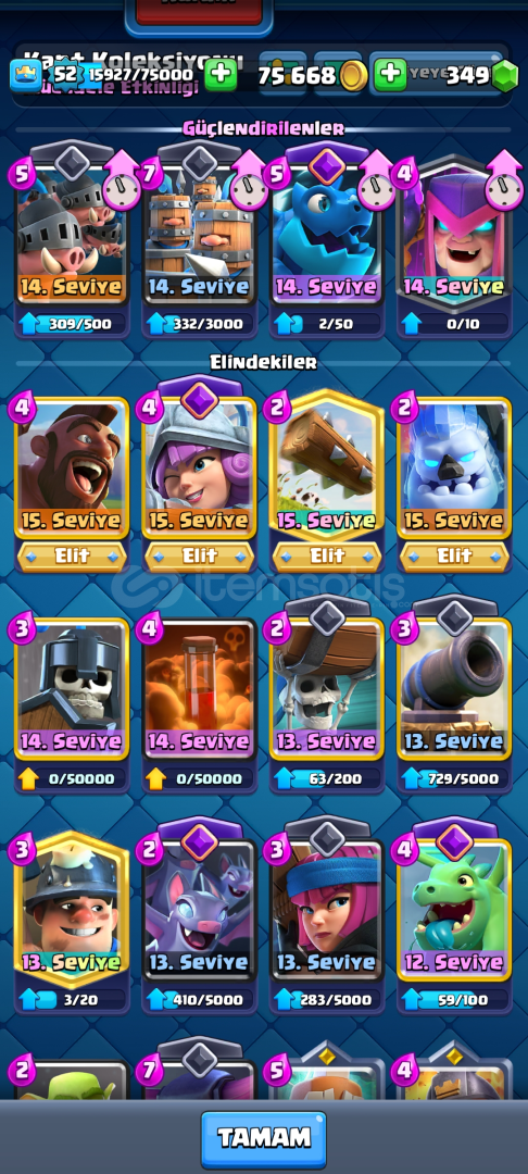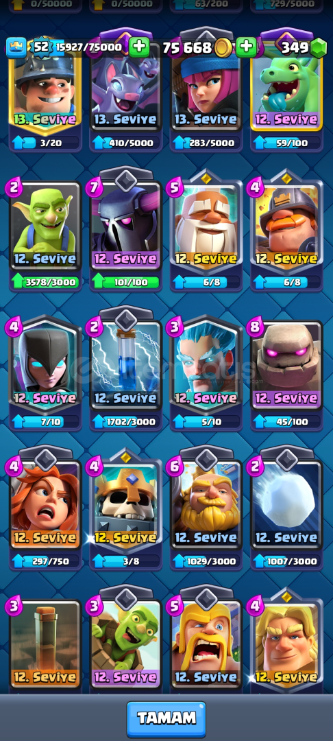 İlk başta pazarlık istenirse yaparım hesapta 8 tane evrim bulunmakta yeni gelen yavru ejderha evrimide bulunmaktadır hesap maksimum 11400 kupa olmuştur hesapta çoğu leveller 12 dir ama 12 üstü 13-14 de vardir hesapta 2.6 oynadığım için 2.6 kartlari yüksek levellidir detaylı bilgi için lütfen bana ulaşın.