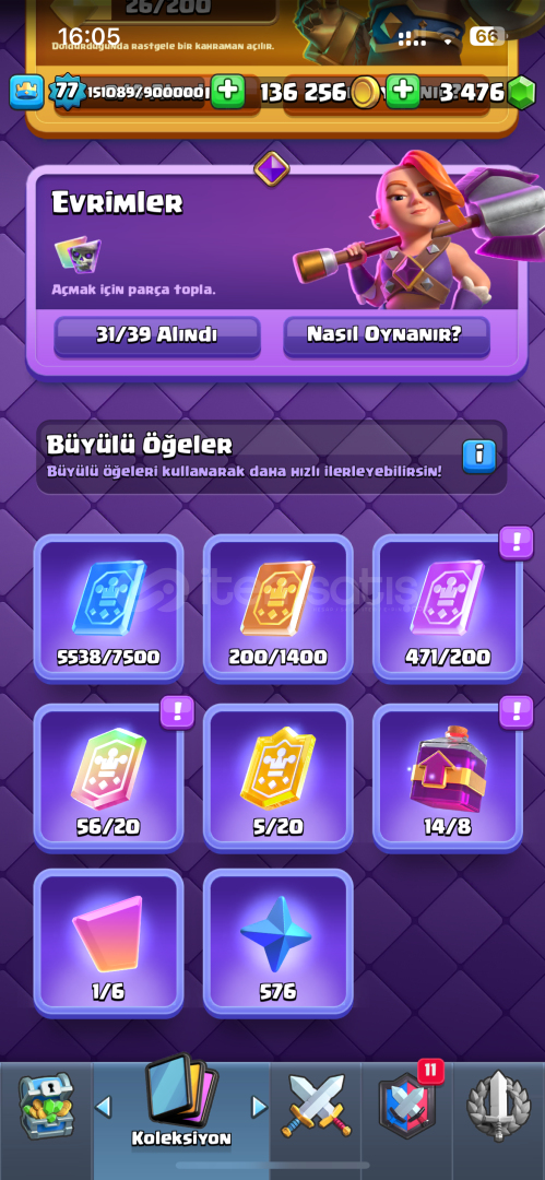 77 level full 15 2 tane 16 level . 150+ emoji 4bin taş.31 tane evrim. Envanteri dolu hesap. Altin olursa 16 level yapilacak kartlar var.