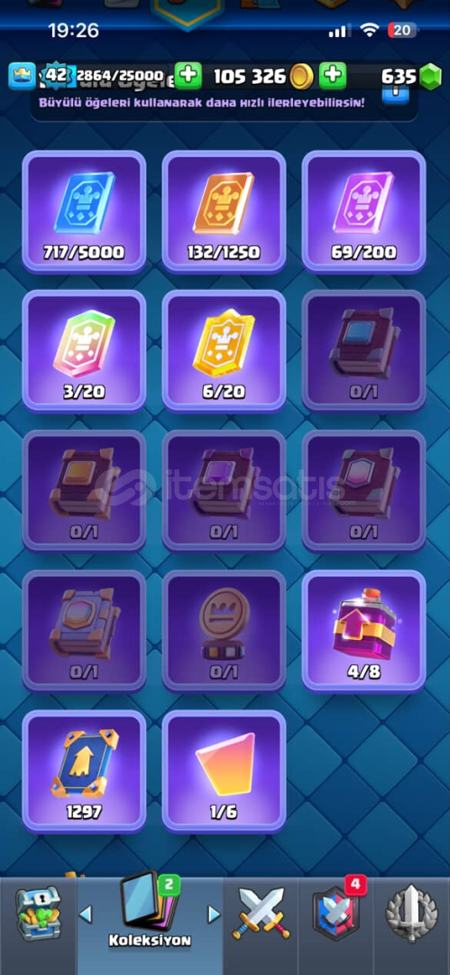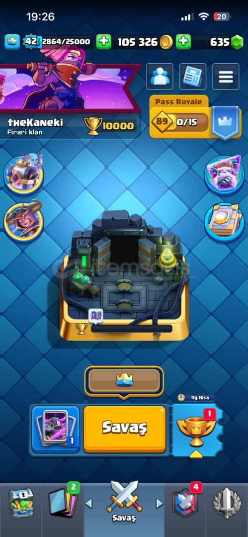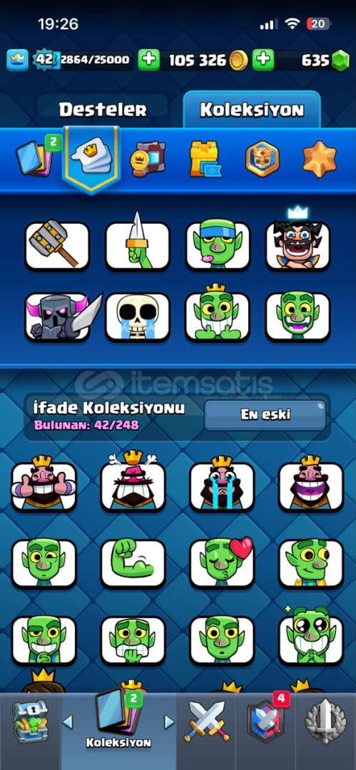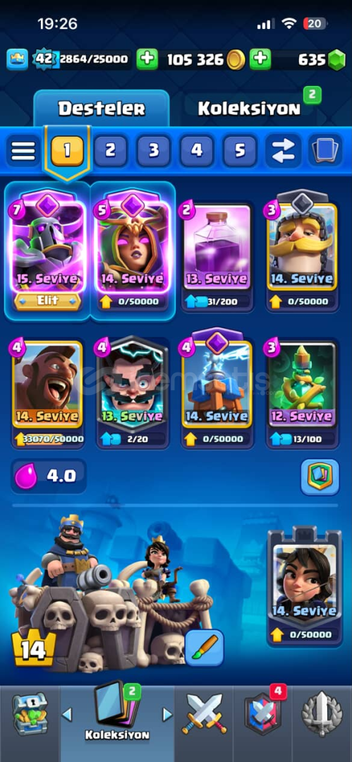 👑 Kral Seviyesi: 42💰 Altın: 105.000+💎 Taş: 635📚 Kart Seviyeleri:PEKKA 15. Seviye (Elit)Cadı Kraliçe 14. SeviyeŞifalı Ruh, Büyücü, Kraliyet Devi, Elektrik Büyücüsü, Tesla, Goblinler gibi meta deste kartları🧠 Destede Ortalama İksir: 4.0💼 Büyülü Öğeler: Bol miktarda kitap, jeton ve joker kart (kart geliştirmeye hazır)😎 İfade Kol...