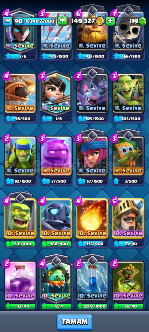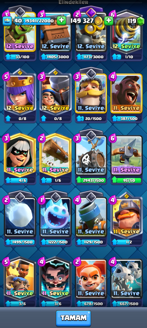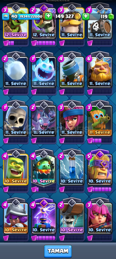 ✅HESABIN ID'Sİ👉#ULCQR9C90 ROYALE APİ SİTESİNDEN HESABA DETAYLICA BAKABİLİRSİNİZ✅HESAP 7.816 KUPALIDIR✅3 YILLIK HESAPTIR ✅40 SEVİYEDİR ✅149 BİN ALTIN VE 119 ELMAS VARDIR ✅118 KART VARDIR (GOBLİNSTEİN KEŞİŞ VE BOS HAYDUT EKSİK )✅KART SEVİYELERİ YÜKSEKTİR✅VALKÜR EL...