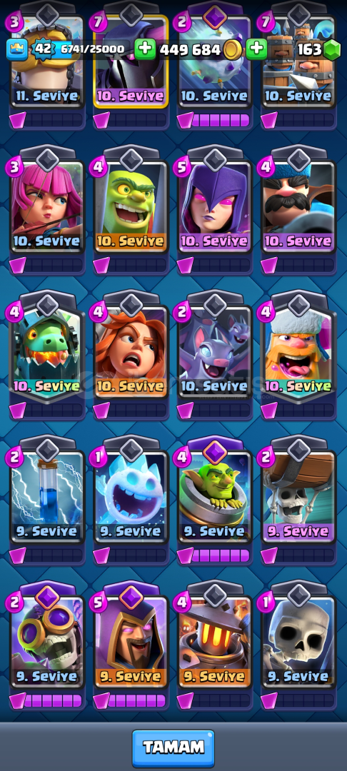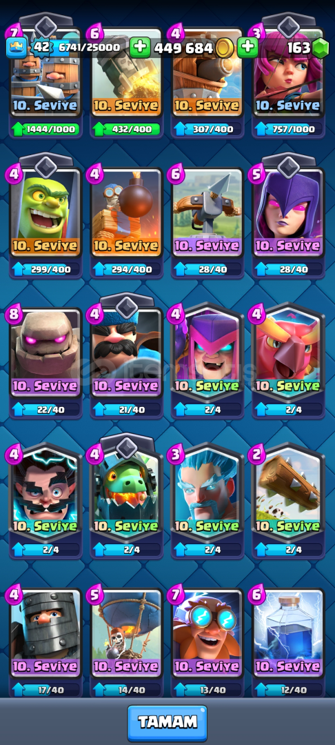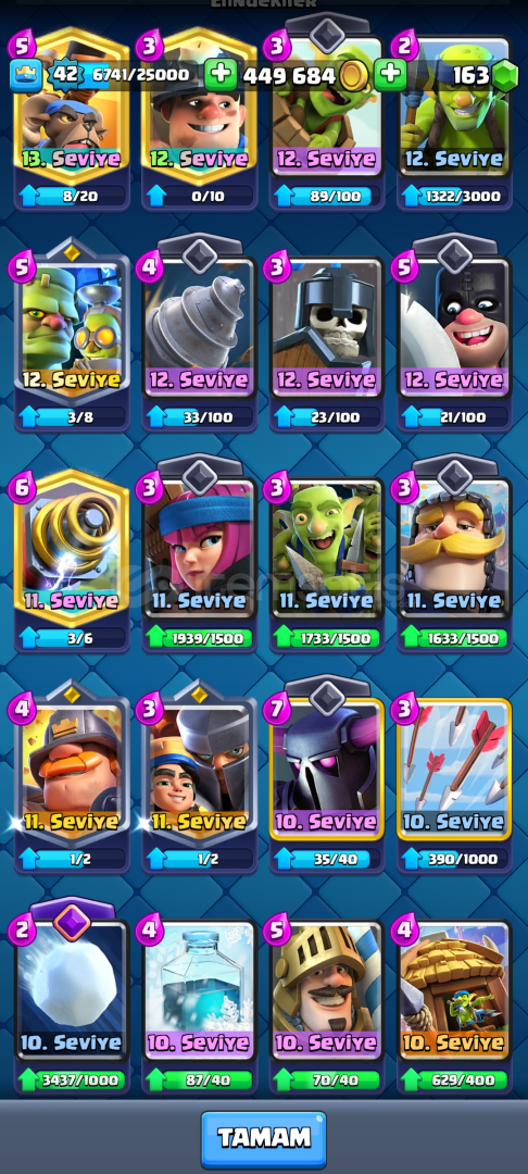 ✅HESABIN ID'Sİ👉#2R2029CV0 ROYALE APİ SİTESİNDEN HESABA DETAYLICA BAKABİLİRSİNİZ✅HESAP 8.109 KUPALIDIR ✅8 YILLIK HESAPTIR✅42 SEVİYEDİR✅449 BİN ALTIN VE 163 ELMAS VARDIR✅115 KART VARDIR ✅KART SEVİYELERİ YÜKSEKTİR ✅KOÇ BİNİCİSİ VE BARBARLAR ELİT SEVİYEDİR &#...