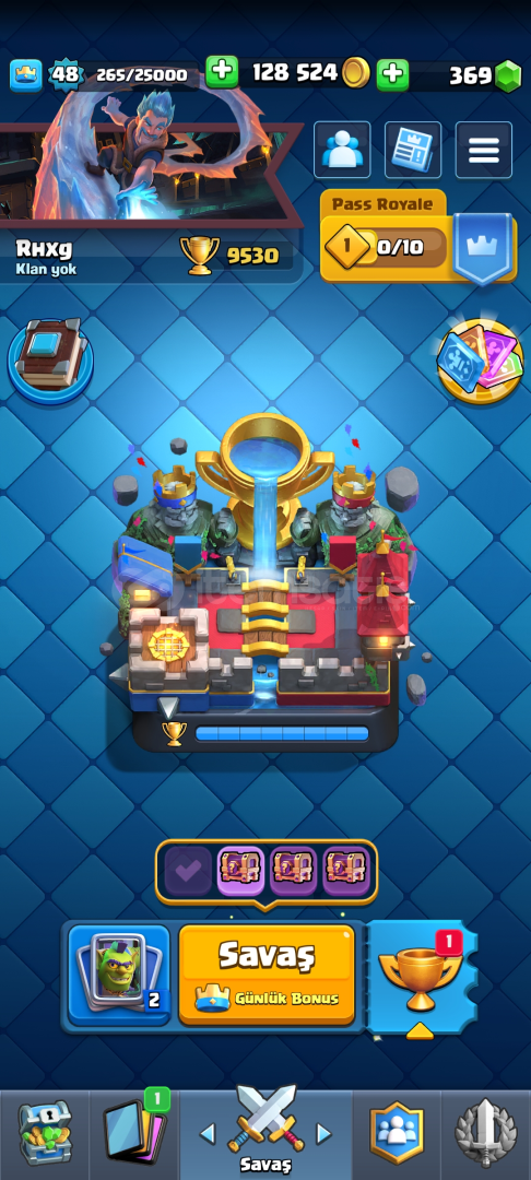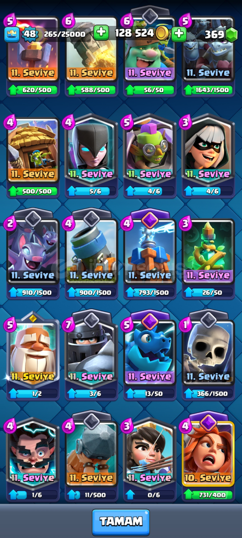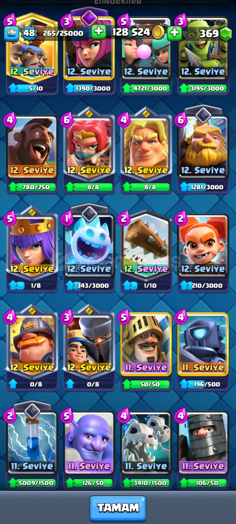 ✅HESABIN ID'Sİ👉#V08L922VY ROYALE APİ SİTESİNDEN HESABA DETAYLICA BAKABİLİRSİNİZ ✅HESAP 9.530 KUPALIDIR✅2 YILLIK HESAPTIR✅48 SEVİYEDİR✅128 BİN ALTIN VE 369 ELMAS VARDIR✅120 KART VARDIR (GOBLİNSTEİN EKSİK✅KART SEVİYELERİ ÇOK YÜKSEKTİR ✅GOBLİN KAFESİ ŞÖVALYE BUZ BÜYÜCÜSÜ VE YAV...