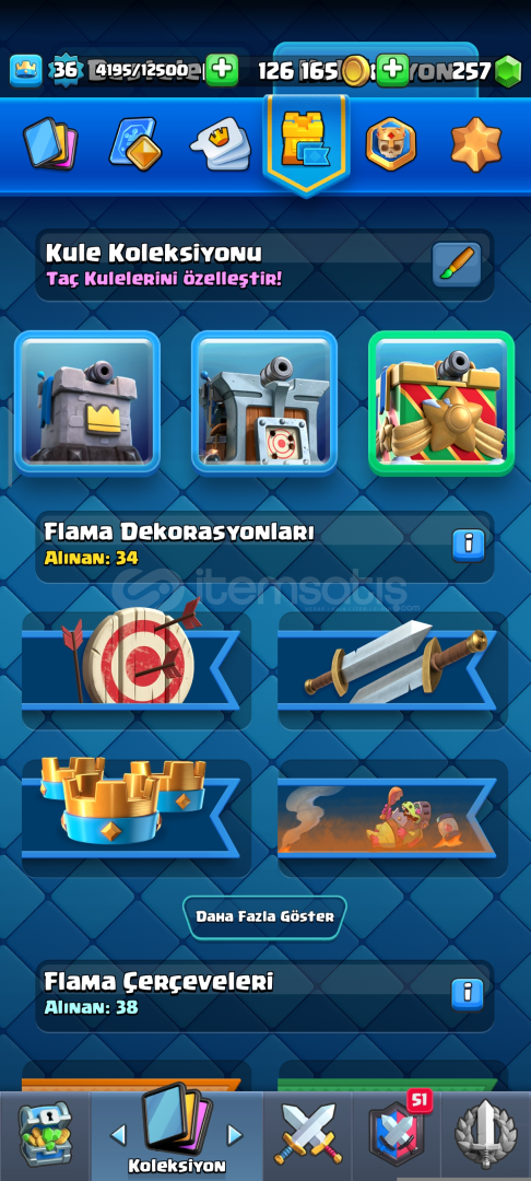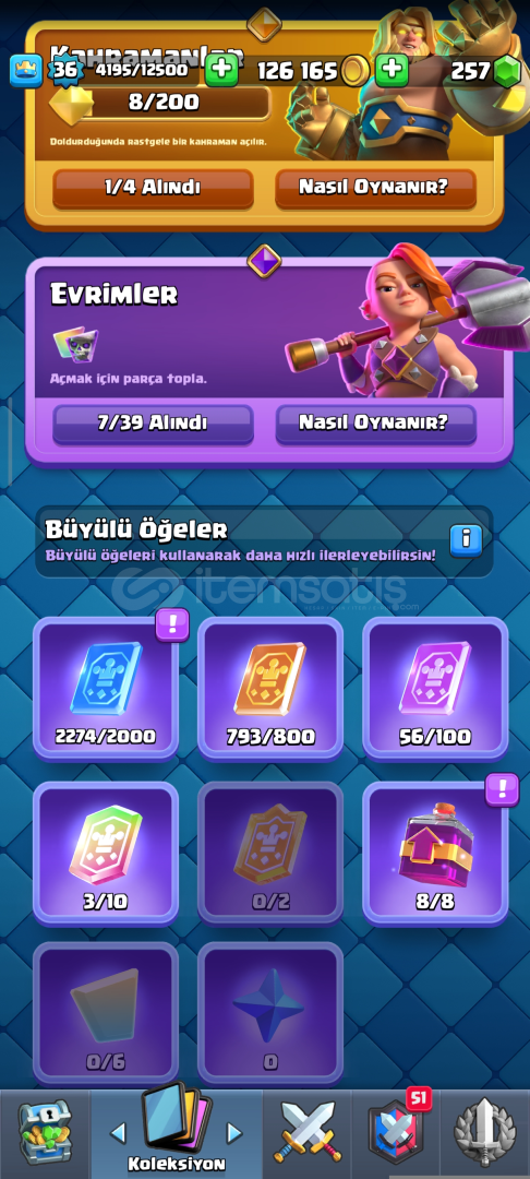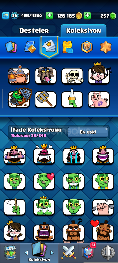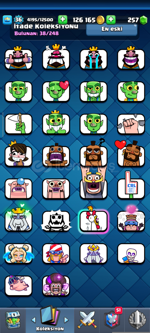 kendi açtığım CR hesabım.Hesapta emoji satın aldım.hesap içeriğim:olmayan kartlar: ruh imparatoriçesi, küçük prens, güçlü madenci,okçu kraliçe,keşiş,boss haydut,gobinstein.evrimler:avcı,okçu, büyücü,elektro ejderha, koçbaşı,tesla,cadı(havanda 4parça,oduncuda 2 parça var)kahraman olarak silahşör var.emojiler g&ou...