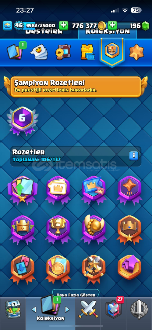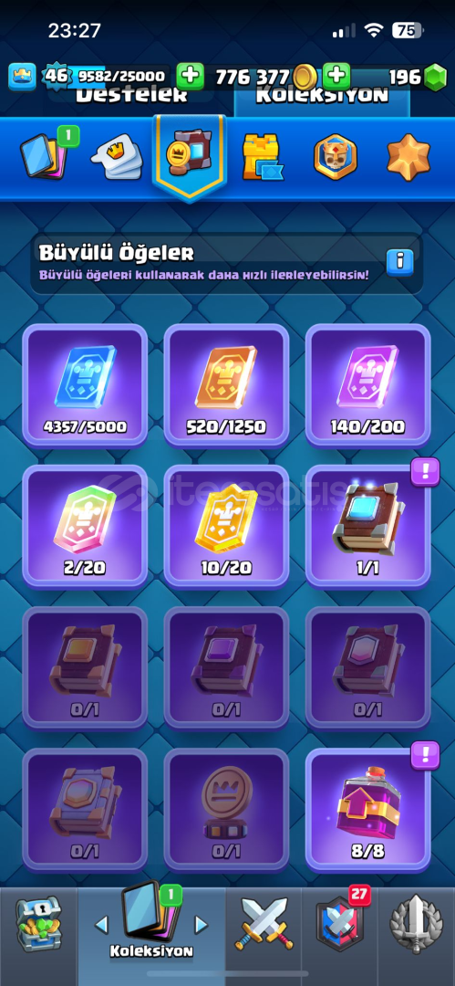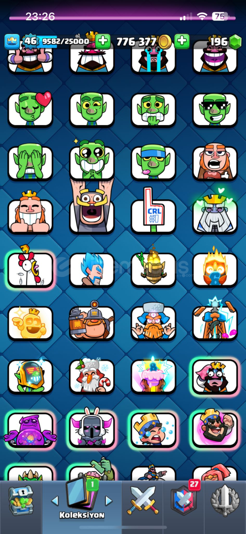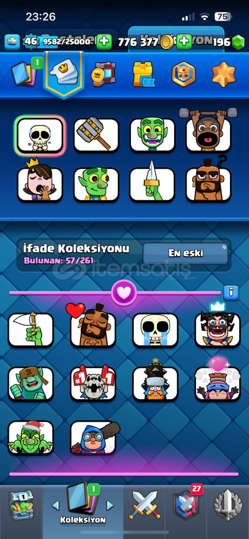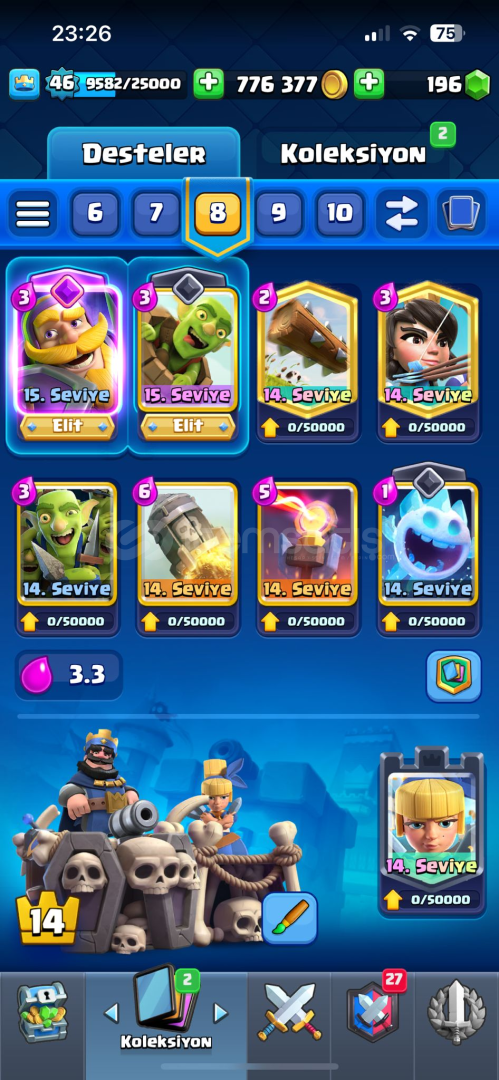 Hesap LogBait Full 2 elit düşes 14 41 seviye içinde baya emote 6 yıllık hesap baya joker kart var 8100 kupa 10 evrimi var alana hayırlı olsun 776k gold 200 cevher var içinde