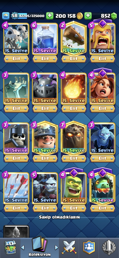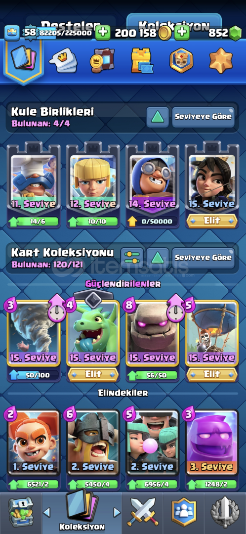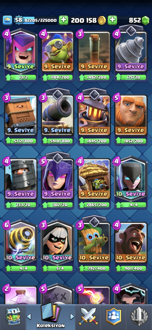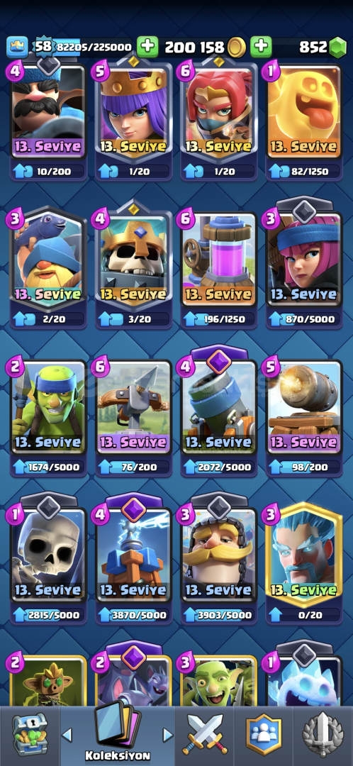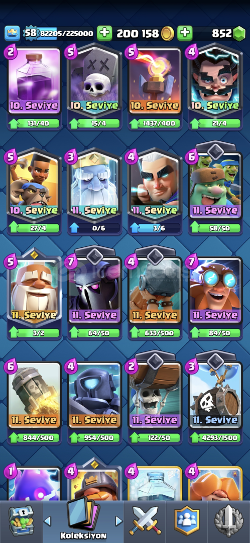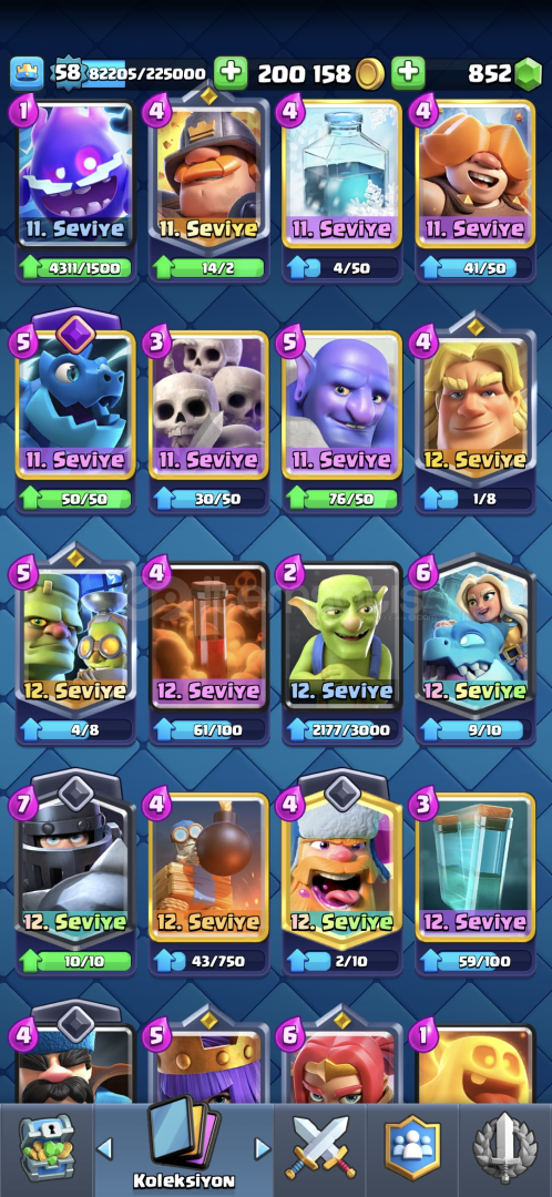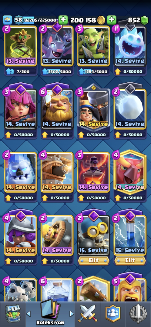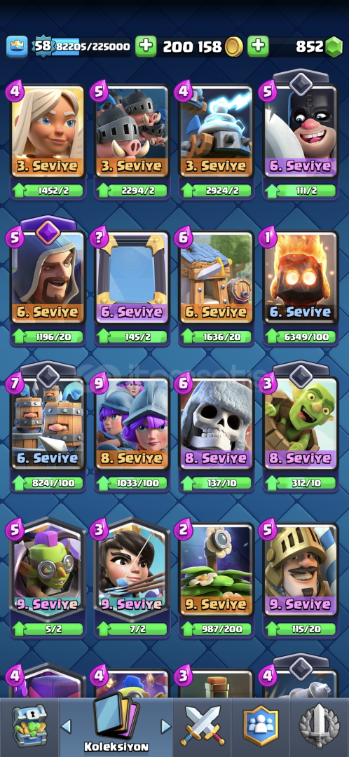 Calsh Royale Level58 bknz Resimler oyun Hesabı. 20 x Elite Cards. 14 evrilmiş Cards. 11.000 Kupa. 120 toplam Cards. 199000+ Altın. 852 Gems. Yeni sahibine şimdiden hayırlı olsun.