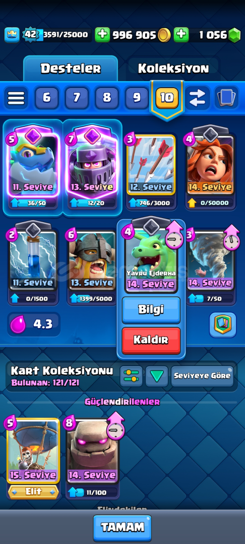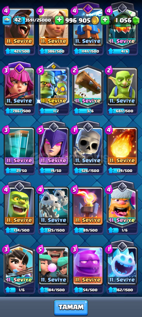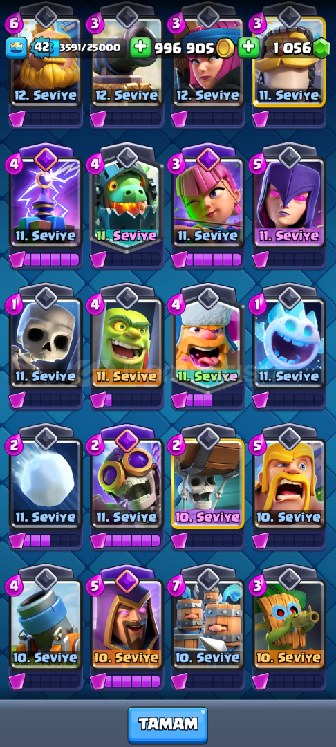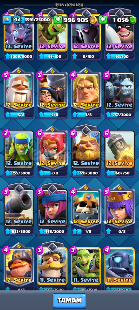 ✅HESAP 8.025 KUPALIDIR✅3 YILLIK HESAPTIR ✅42 SEVİYEDİR ✅996 BİN ALTIN VE 1056 ELMAS VARDIR ✅BÜTÜN KARTLAR VARDIR✅KART SEVİYELERİ ÇOK YÜKSEKTİR✅BALON ELİT SEVİYEDİR✅VALKÜR 14 SEVİYEDİR✅MEGA ŞÖVALYE ELEKTRO EJDER TESLA OKÇU BÜYÜCÜ VE BOMBACI EVRİMİ VARDIR ✅BÜYÜLÜ ÖĞELERİ ...