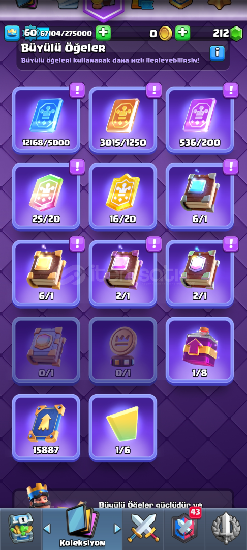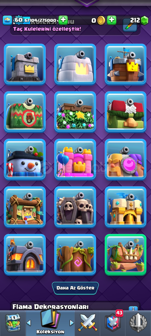 Hesapta 27 elit kart vardır 18 tane 14 level kart vardır hesapta şöyle bir durum var yeni gelen 3-4 kart hariç bütün kartların toplanması gereken kartı full ancak altın olmadığı için yavaş yavaş yükseltiliyor yani sandıklardan işe yarar birşey çıkmıyor artık hesaba sayısız defa pass royale alındı bir sürü emoji var bir süre kule görünümü zaten hesabın envanteri dopdolu bir sürü kartlar kitabı var harika ötesi hesap.
