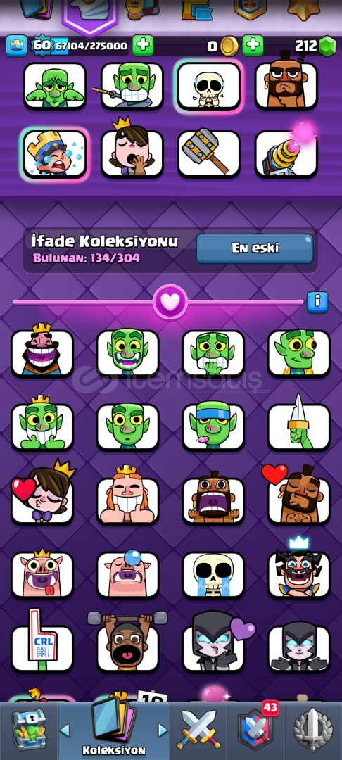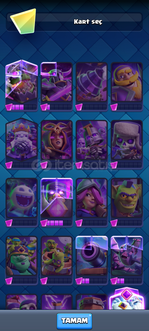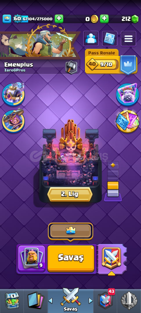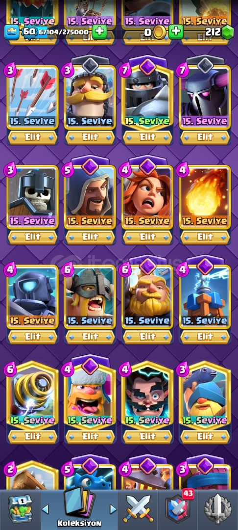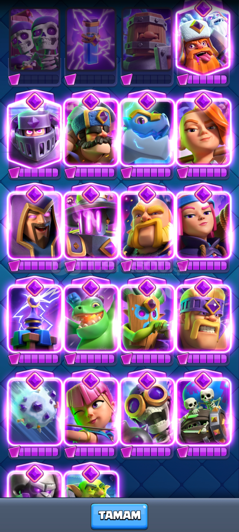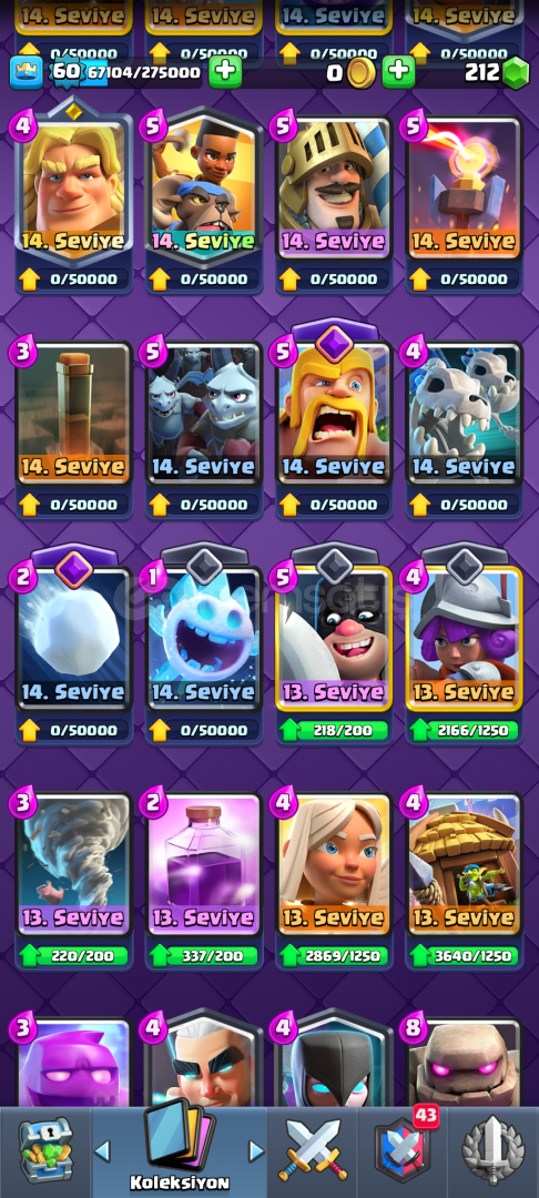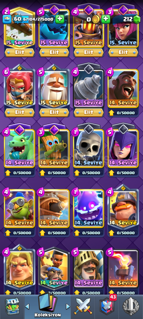 Hesapta 27 elit kart vardır 18 tane 14 level kart vardır hesapta şöyle bir durum var yeni gelen 3-4 kart hariç bütün kartların toplanması gereken kartı full ancak altın olmadığı için yavaş yavaş yükseltiliyor yani sandıklardan işe yarar birşey çıkmıyor artık hesaba sayısız defa pass royale alındı bir sürü emoji var bir süre kule g&o...