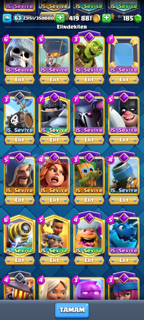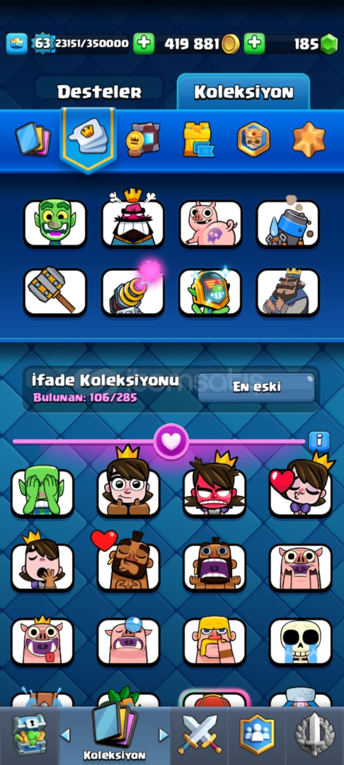 Clash Royale 9 Yıllık 63 Level Hesap Satılıktır.Mail ile teslim edilecektir.400.000 Adet Altın Var.34 Tane 15 Level Kart Var.83 Tane 14 Level Kart Var.4 Tane 13 Level Kart Var.20 Tane Evrim Açık.106 Tane İfade Var.129 Adet Flama Var.135 Adet Flama Çerçevesi Var.13 Adet Kule Görünümü Var.İsim Değiştirme Hakkı Var.Bilgiler Fotoğrafta Mevcut.Alana Hayırlı Olsun.Tel Numarası Kay&#...