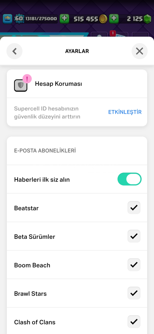 Merhaba hesapla ilgili Bilgiler şunlardır Hesabımız 7 seneliktir Hesapta 21 adet kart elit seviyedir (15 seviye)+100 emoji toxic emojiler mevcutturKraliyet devi dedesi havan desteleri full durJoker kartlarla seviyelerinizi daha cok arttırabilirsinizHesapta aktif 500 k altin ve 2 k elmas bulunmaktadır Hesap e posta devir ile verilecektir e posta temiz 0 dır hesap korumasi kapalıdır hesaba bizzat kefilimdir Pazarlık yapılmaz ölü fiya...