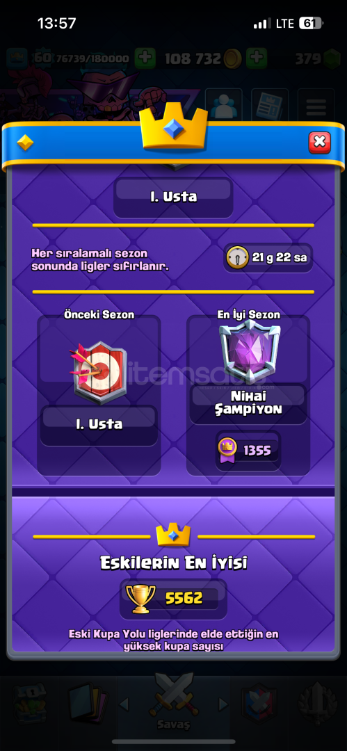 Hesap nihai şampiyon 60 lvl 10400 kupada 15 tane evrimi açık 2 tane şampiyon evrimi var (mini pekka, şövalye )21 tane 15 lvl kart emojisi bol RP si açık