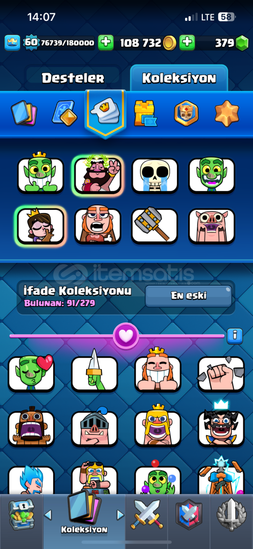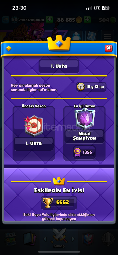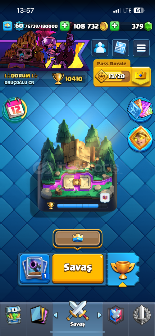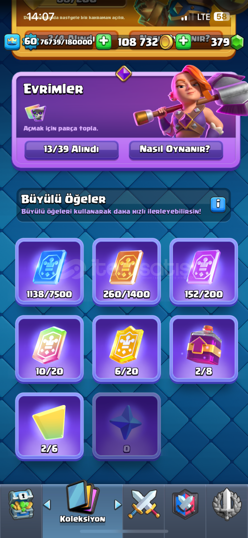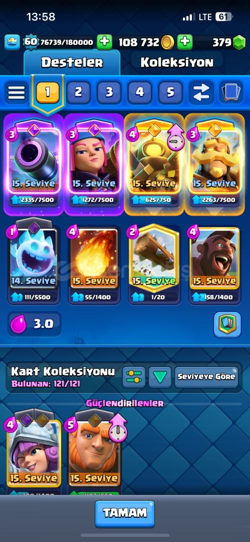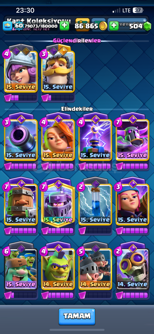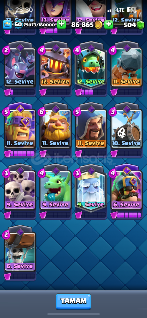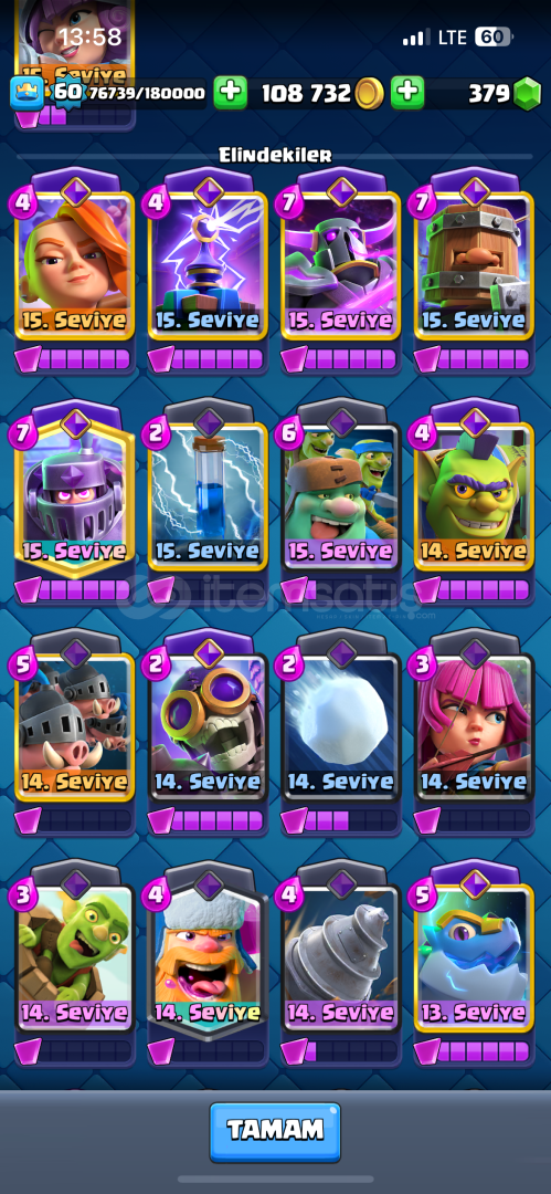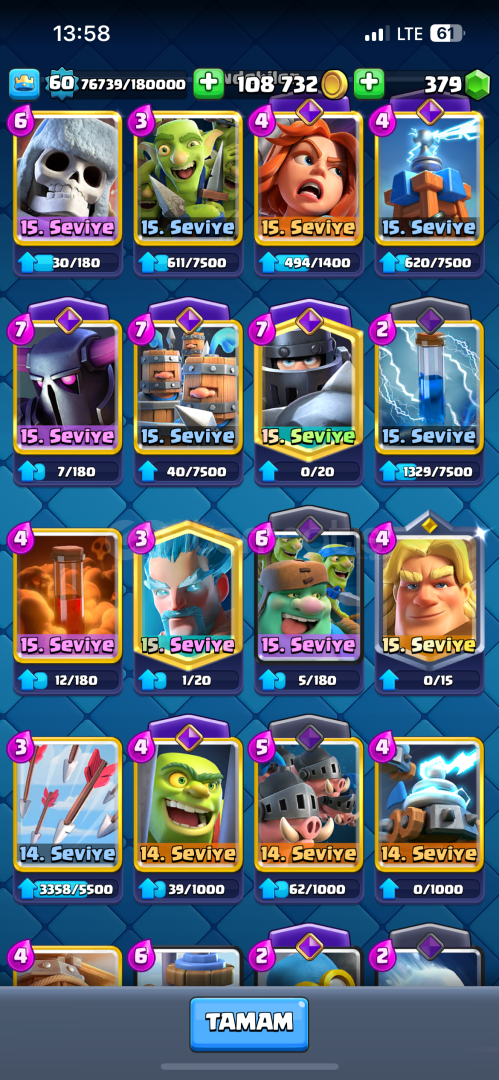 Hesap nihai şampiyon 60 lvl 10400 kupada 15 tane evrimi açık 2 tane şampiyon evrimi var (mini pekka, şövalye )21 tane 15 lvl kart emojisi bol RP si açık