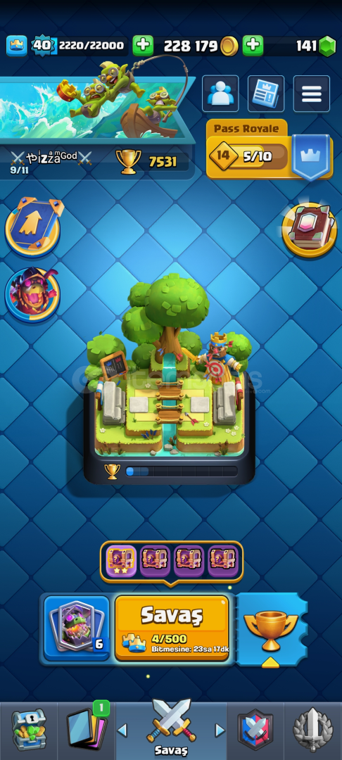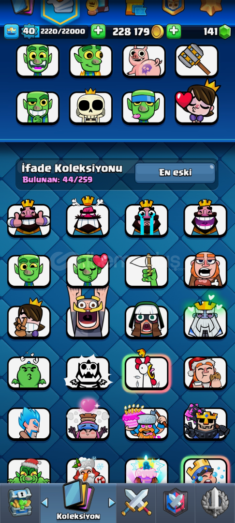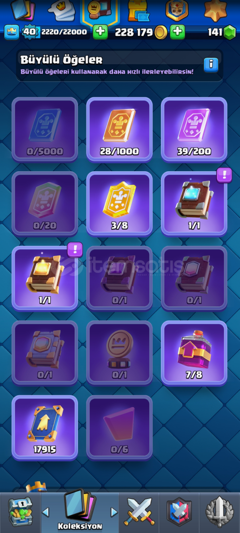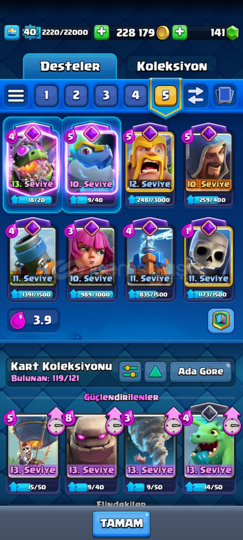 Hesap'da 119 kart vardır eksik olanlar( Keşis ve okçu kraliçe ) Hesap 20. Arena 7531 kupa 40 seviyedir 8 tane Evrim vardır fiyat 2500 TL dir(Pazarlık vardır)