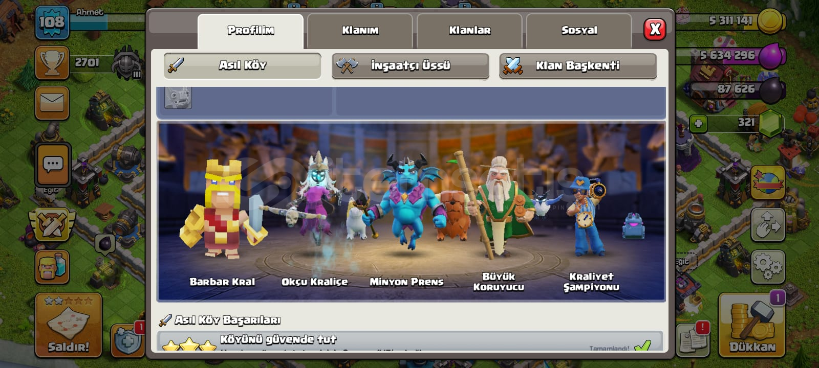 26 seviye 460.000 altın 350 elmaslı 16.arena 3400 kupa 13 güzel emojili (oyunun başında verilen 4 emoji dışında) kule kostümlü evrimli kartlar mevcut flama dekorasyon ve çerçeve vardır her ikisinde haraketli dekorasyon ve çerçeve mevcut 4-5 yıllık hesap