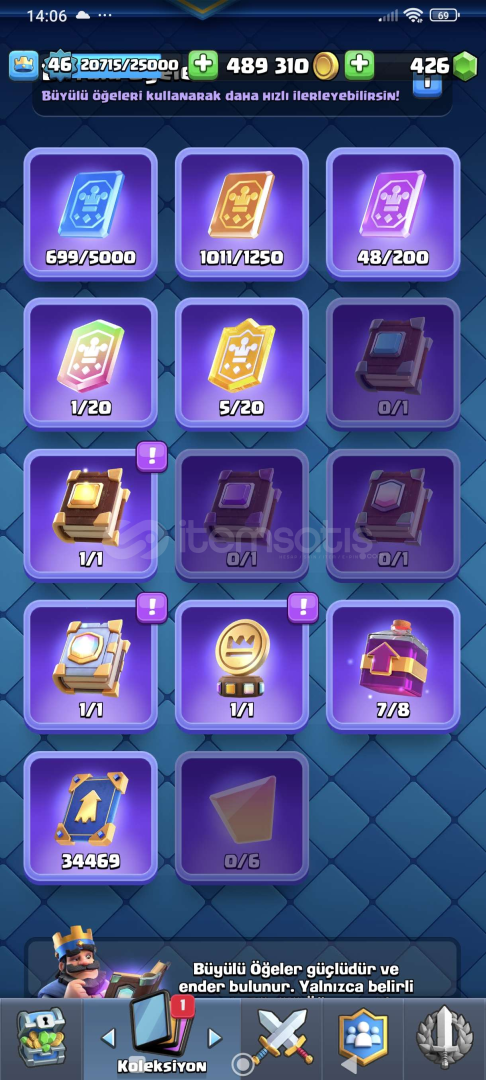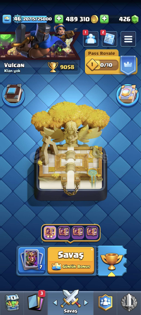 Sarmaşık hariç tüm kartlar vardır 8 tane evrim mevcuttur Evrimler:CadıBüyücüTeslaKraliyet DeviMega Şövalye OkçularBombacıHavai Fişekçi ŞövalyeBrawl Stars hesabı mevcuttur 67 tane karakter mevcuttur Karakterler:8 Ender10 Süper Ender28 Destansı 16 Gizemli4 Efsanevi  Ve 109 tane kostüm bulunmaktadır pazarlık vardır