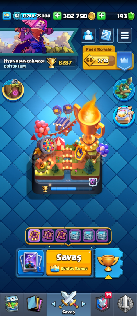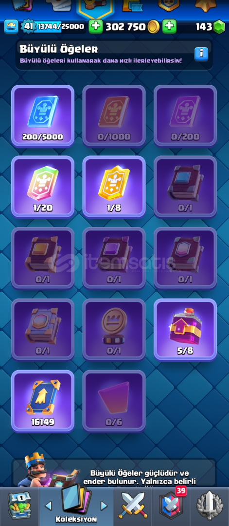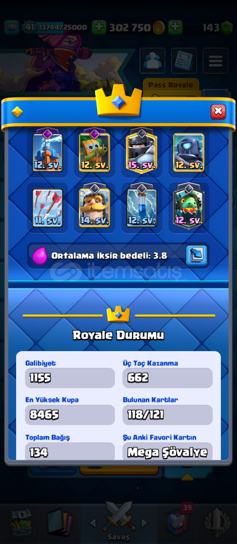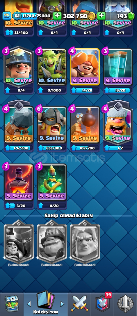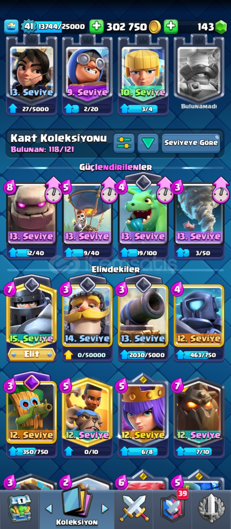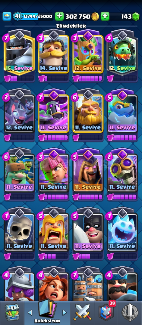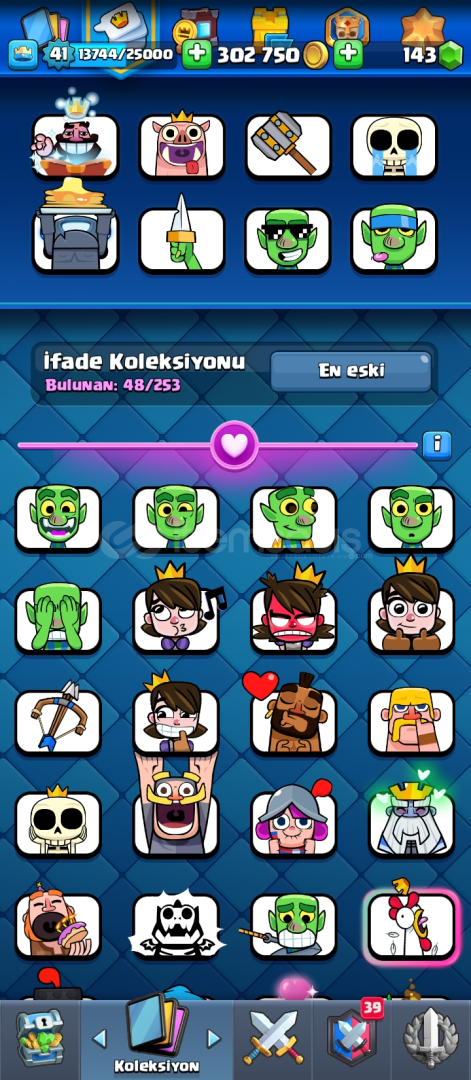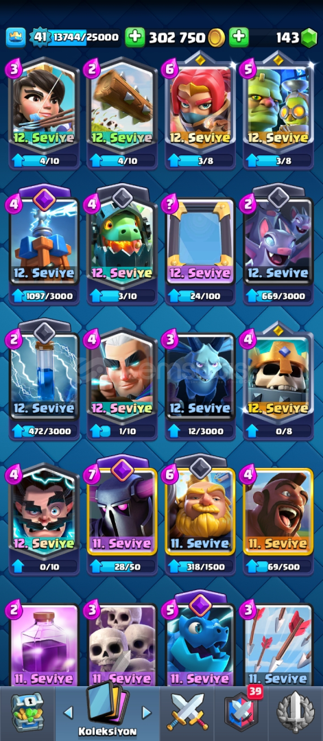 Hesap 8300 kupa 1 adet elit 1 adet 14 seviye var 48 emoji 6 adet evrim var evrim parçası olan kartlar da var