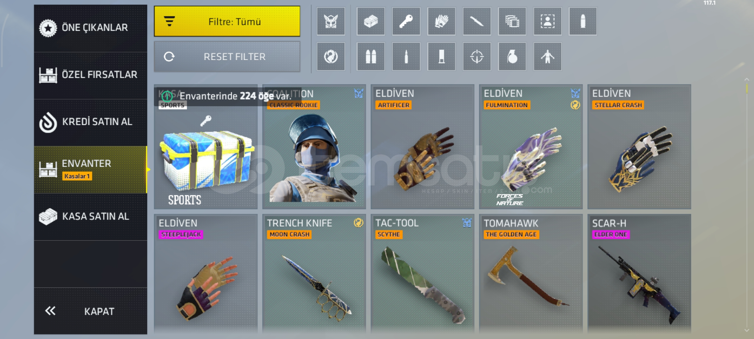 hesap 400 küsür seviyedir6.sezondan kalmadır4 bıçak 4 eldiven 6 anımasyon 1 karakter olmak üzere 225 öğe vardır.pass açıktır.bırakıyorum