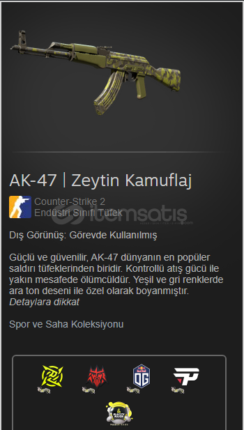 Güçlü ve güvenilir, AK-47 dünyanın en popüler saldırı tüfeklerinden biridir. Kontrollü atış gücü ile yakın mesafede ölümcüldür. Yeşil ve gri renklerde ara ton deseni ile özel olarak boyanmıştır. Detaylara dikkat Spor ve Saha KoleksiyonuÇıkartma: Ninjas in Pyjamas | Paris 2023, forZe eSports | Paris 2023, OG | Paris 2023, paiN Gaming | Paris 2023, BL...