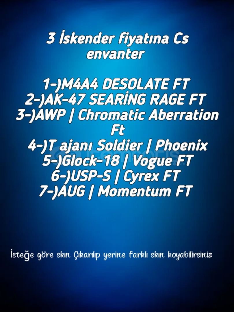 3 İskender fiyatına Cs envanter 1-)M4A4 DESOLATE FT 2-)AK-47 SEARİNG RAGE FT 3-)AWP | Chromatic Aberration Ft4-)T ajanı Soldier | Phoenix5-)Glock-18 | Vogue FT6-)USP-S | Cyrex FT 7-)AUG | Momentum FT Skın çıkarıp koymak için dm