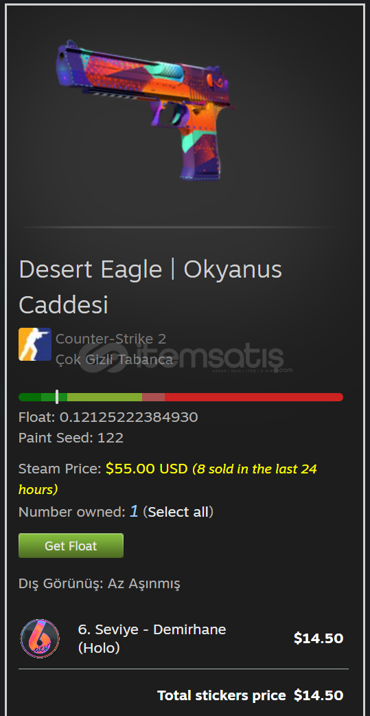 T.AKAS BANI MEVCUTTUR [ 16.06.2025 ] 10.00'da BANI KALKACAKTIR, LÜTFEN T.AKAS BANI KALKANA KADAR SATIN ALMAYINIZ.Desert Eagle | Okyanus Caddesi / Desert Eagle | Ocean DriveÜZERİNDE 1 ADET STİCKER BULUNMAKTADIR. STİCKERIN DEĞERİ 14.5 DOLAR ETMEKTEDİR.Float: 0.12125222384930Paint Seed: 12212 saat içerisinde teslim. ( Aktif olduğum an teslimatı sağlarım. )SATIN ALMADAN ÖNCE MUTLAKA OKUYUNUZ!1- STEAM HESABINIZIN TRADE BANININ KE...