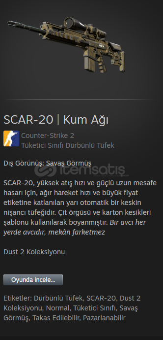 Satın alımdan sonra lütfen trade linkinizi atınız.SCAR-20, yüksek atış hızı ve güçlü uzun mesafe hasarı için, ağır hareket hızı ve büyük fiyat etiketine katlanılan yarı otomatik bir keskin nişancı tüfeğidir. Çit örgüsü ve karton kesikleri şablonu kullanılarak boyanmıştır. Bir avcı her yerde avcıd&#...