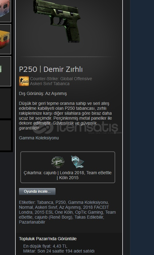 P250 | Demir Zırhlı Az Aşınmış (Minimal Wear)Üzerinde 2 adet biri 5 tl diğeri 50 tl sticker bulunmakta.Silah iyi durumdadır