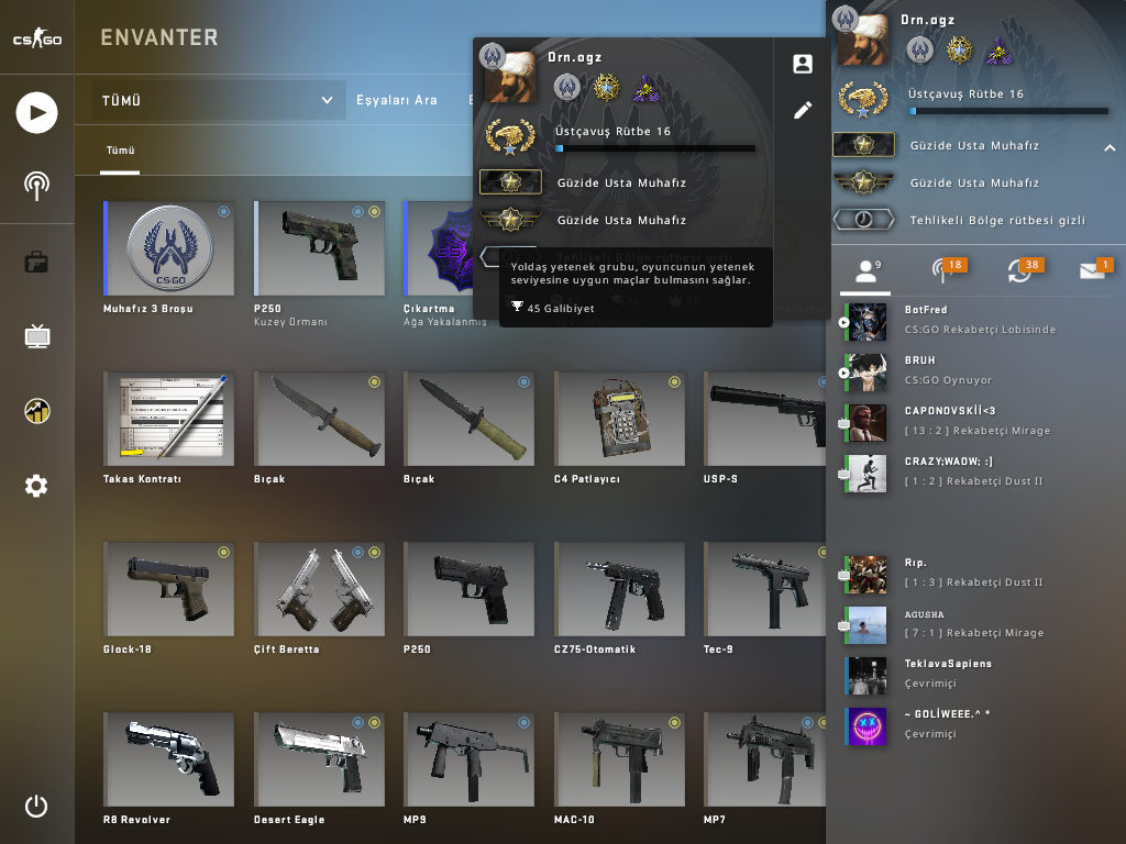 1-Rekabetçi rankı DMG2-Yoldaş rankı DMG3-+400 Saati olan 4-Steam hesap değeri 600 TL olan5-Hesap içinde 30 oyun vardır6-Herhangi bir vac yememiştir7-3 CS Go Madalyası vardır8-Her türlü alıcı arkadaşımıza yardımcı olunmaya çalışılacaktır
