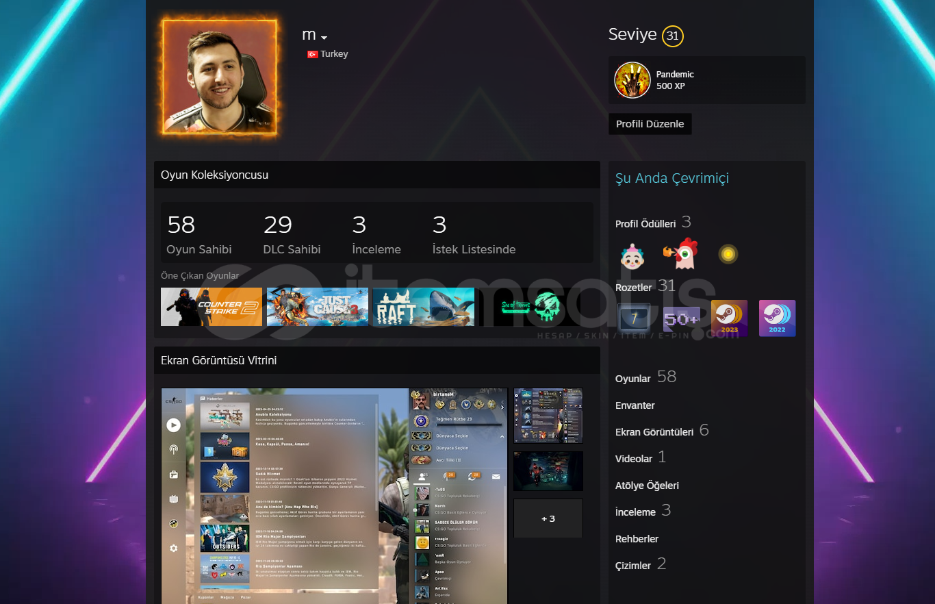 🧩 Genel BilgilerSteam Seviyesi: 31Toplam Oyun: 58DLC Sayısı: 29Profil Ödülleri: 3🎮 Öne Çıkan OyunlarCounter-Strike 2RaftSea of ThievesPummel PartyTower UniteMetro Exodus Enhanced Edition(Tüm oyun listesi profilinde mevcut; toplam 58 oyun.)🏅 CS2 / CS:GO Madalya & JetonlarıSeason 2 Jetonu (Rank: 26.254) (Kırmızı Seçkin Derecesi)Season 1 Jetonu2025 Hizmet Madalyası2024 Hizmet Madalyası2023 Hizmet ...