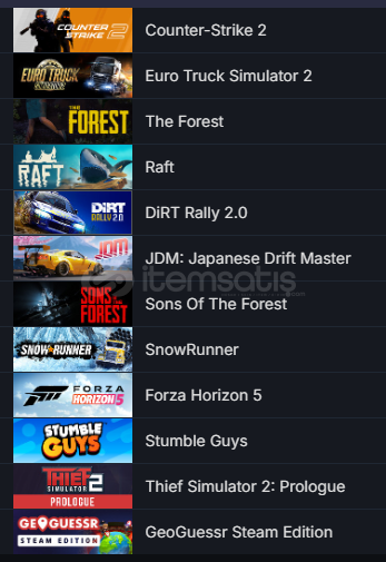 OYUNLAR :CS GO 2 PRİME ETS 2 Forza Horizon 5 Raft SnowRunner Sons Of The Forest JDM: Japanese Drift Master DiRT Rally 2.0  The Forest Stumble Guys Thief Simulator 2: Prologue GeoGuessr Steam Edition