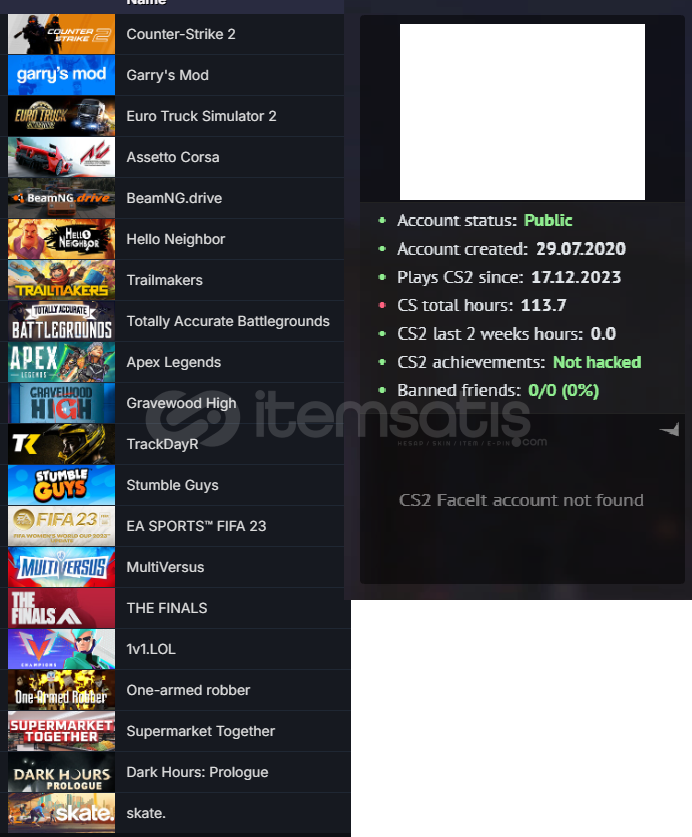 2 MADALYALI 5 LV 200 TL STEAM BAKİYELİ ETS 2 FIFA 23 TrackDayR 2850 TL STEAM OYUN ENVANTERLİ MAİNLİKMADALAYA:5 YIL JETON GLOBAL OFFİCE BADGE JETONWİN:REKABETCİ : WİN YOLDAŞ: WİNPRİME RANK :REKABETCİ:BELİRSİZGÜVEN FAKTÖRÜ:YEŞİLCS GO SEVİYE:5 LV STEAM LV:3STEAM PUAN:20.561 İSTEDİĞİNİZ HAREKETLİ ALABİLİRSİNİZSTEAM BAKİYE:200CS GO SAAT:1...