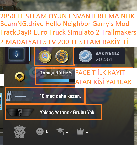 2 MADALYALI 5 LV 200 TL STEAM BAKİYELİ ETS 2 FIFA 23 TrackDayR 2850 TL STEAM OYUN ENVANTERLİ MAİNLİK