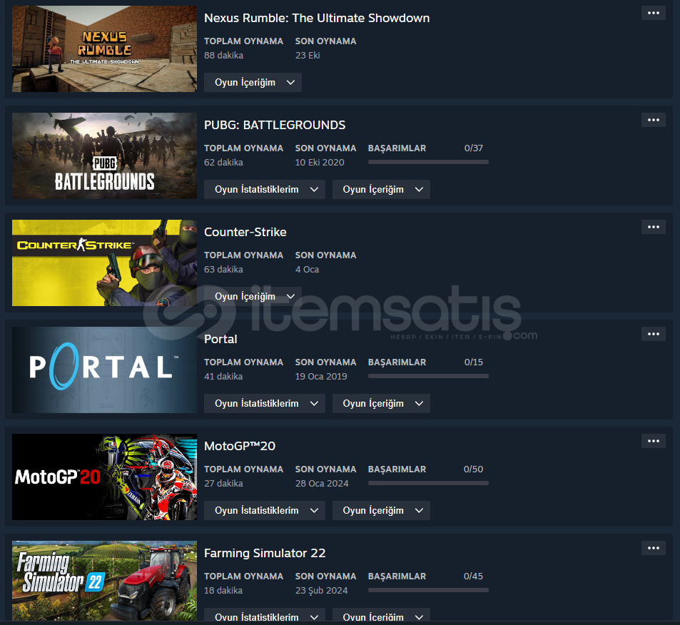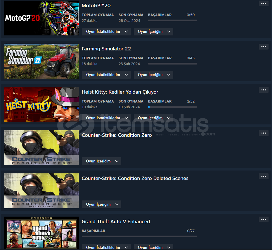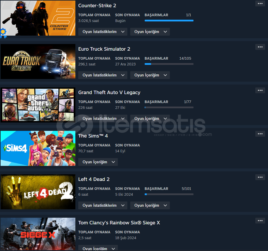 Grand Theft Auto V (GTA 5):Rockstar klasiği olan GTA 5 oyunu da kütüphanede mevcuttur ve sorunsuz oynanabilir durumdadır.Counter-Strike 2 (CS 2):3000 saatin üzerinde oynanma süresi bulunmaktadır.Hesapta toplam 11 adet değerli Madalya ve Jeton (Hizmet Madalyaları, Operasyon Jetonları vb.) mevcuttur. Bu, hesabın ne kadar eski ve değerli olduğunu gösterir.SKİNLER :AWP | Hiper CanavarAWP | Renk Sapmaları★ Avcı...