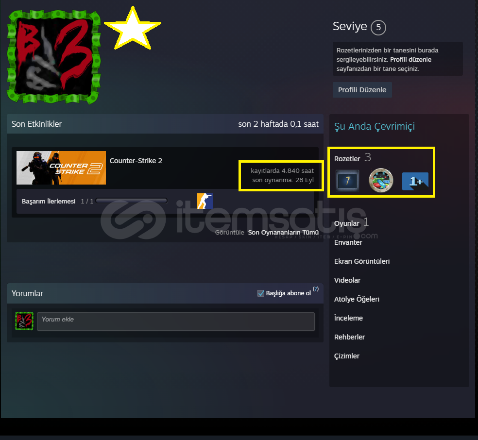 + Otomatik Teslimat Bekleme Süresi Yaşamadan Online Olmamızı Beklemeden+ Ürününüzü Satın Aldığınız An itibari-ile Bilgiler Sizlere Otomatik Gönderilecektir.-----Hesap Bilgileri-----+ Prime & Seçkin+ 4,850 Saat CS:GO Oynama Süresi+ 7 Yıllık Hesap+ Güven Faktörü: Yeşil+ CS:GO Seviyesi : 15+ Steam Seviyesi : 5-----Madalya Bilgileri-----1 : Sadakat Rozeti2 : Elmas Kırık Di&#...