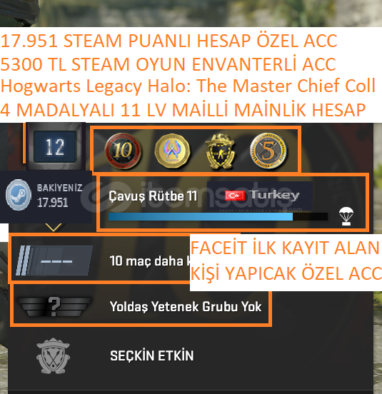4 MADALYALI 11 LV Hogwarts Legacy Halo:The Master Chief 5300 TL STEAM OYUN ENVANTERLİ MAİLLİ MAİNLİK ACCMADALAYA:10 YIL JETON 5 YIL JETON GLOBAL OFFİCE BADGE JETON SADAKAT ROZETİWİN:REKABETCİ :PRİME RANK :REKABETCİ:BELİRSİZGÜVEN FAKTÖRÜ:YEŞİLCS GO SEVİYE:11STEAM LV:7STEAM PUAN:17.951 İSTEDİĞİNİZ HAREKETLİ ALABİLİRSİNİZSTEAM BAKİYE:CS GO SAAT:İ...