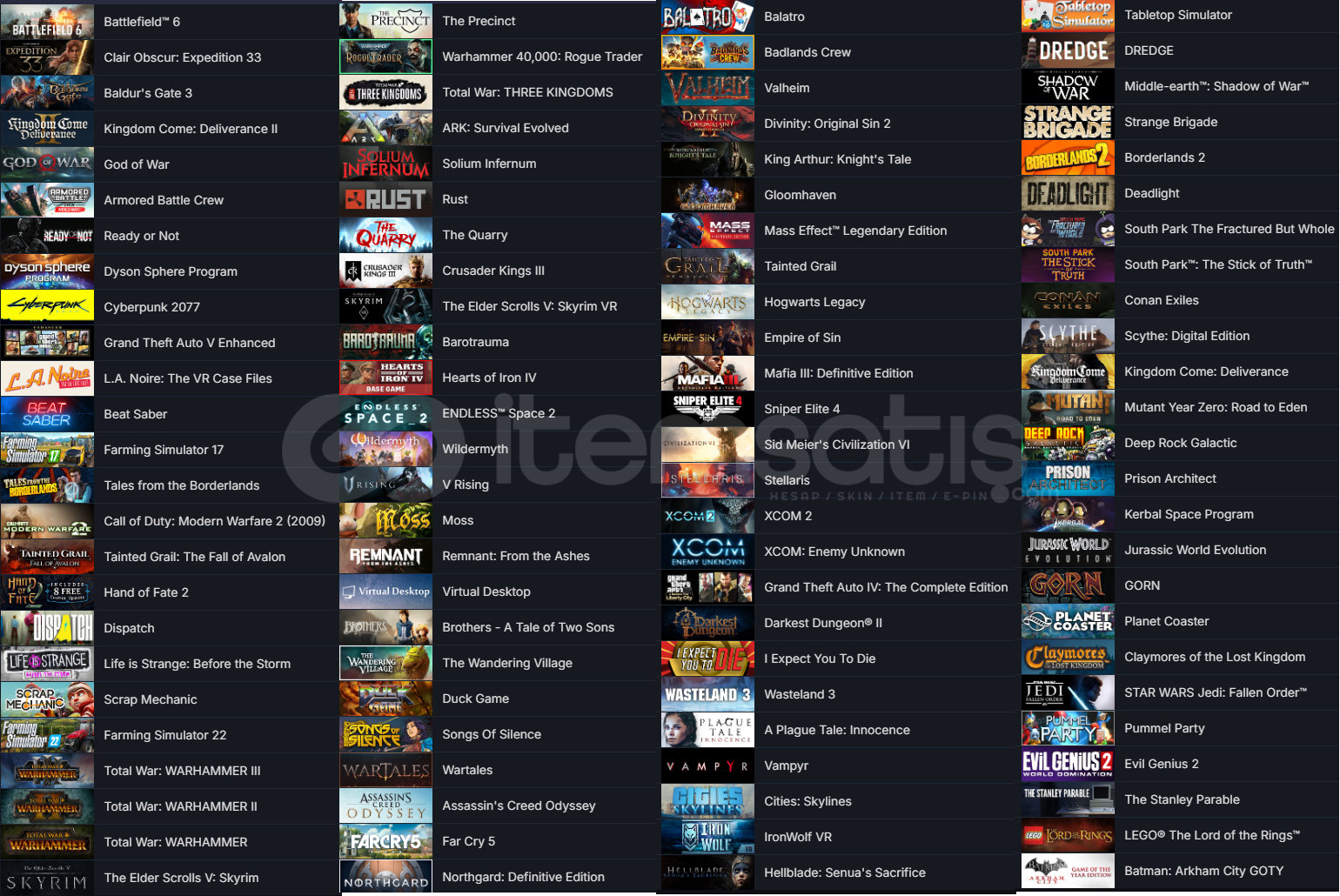 OYUNLAR :CS GO 2 PRİME RUST Battlefield™ 6 Clair Obscur: Expedition 33 Baldur's Gate 3 Kingdom Come: Deliverance II God of War Armored Battle Crew Ready or Not Dyson Sphere Program Cyberpunk 2077 Grand Theft Auto V Enhanced L.A. Noire: The VR Case Files Beat Saber Farming Simulator 17 Tales from the Borderlands Call of Duty: Modern Warfare 2 (2009) Tainted Grail: The Fall of Avalon Hand of Fate 2 Dispatch Life is Strange: Before the Storm Scrap Mechanic Farming Simulator 22 Total War: WARHAMMER III Total War: WARHAMMER II Total War: WARHAMMER The Elder Scrolls V: Skyrim The Precinct Warhammer 40,000: Rogue Trader Total War: THREE KINGDOMS ARK: Survival Evolved Solium Infernum The Quarry Crusader Kings III The Elder Scrolls V: Skyrim VR  Barotrauma Hearts of Iron IV ENDLESS™ Space 2 Wildermyth V Rising Moss  Remnant: From the Ashes Virtual Desktop Brothers - A Tale of Two Sons The Wandering Village Duck Game Songs Of Silence Wartales Assassin's Creed Odyssey Far Cry 5 Northgard: Definitive Edition Balatro Badlands Crew Valheim Divinity: Original Sin 2 King Arthur: Knight's Tale Gloomhaven Mass Effect™ Legendary Edition Tainted Grail Hogwarts Legacy Empire of Sin Mafia III: Definitive Edition Sniper Elite 4 Sid Meier's Civilization VI Stellaris XCOM 2 XCOM: Enemy Unknown Darkest Dungeon® II I Expect You To Die Wasteland 3 A Plague Tale: Innocence Vampyr Cities: Skylines IronWolf VR Hellblade: Senua's Sacrifice Tabletop Simulator DREDGE Middle-earth™: Shadow of War™ Strange Brigade Borderlands 2 Deadlight South Park The Fractured But Whole South Park™: The Stick of Truth™ Conan Exiles Scythe: Digital Edition Kingdom Come: Deliverance Mutant Year Zero: Road to Eden Deep Rock Galactic Prison Architect Kerbal Space Program Jurassic World Evolution GORN Planet Coaster Claymores of the Lost Kingdom STAR WARS Jedi: Fallen Order™ Pummel Party Evil Genius 2 The Stanley Parable LEGO® The Lord of the Rings™ Batman: Arkham City GOTY The Expanse: A Telltale Series The Banner Saga 2 The Banner Saga Arma 3 Detroit: Become Human Batman - The Telltale Series Batman: The Enemy Within The Wolf Among Us Far Cry® 3 Sniper Elite Human Fall Flat Armello The Witcher 3: Wild Hunt Terraria Garry's Mod Weird West: Definitive Edition MudRunner Depth