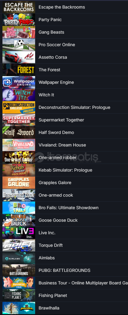 OYUNLAR :CS GO 2 PRİME PUBG PLUS Escape the Backrooms Party Panic Gang Beasts Pro Soccer Online Assetto Corsa The Forest Wallpaper Engine Witch It Deconstruction Simulator: Prologue Supermarket Together Half Sword Demo Vivaland: Dream House One-armed robber Kebab Simulator: Prologue Grapples Galore One-armed cook