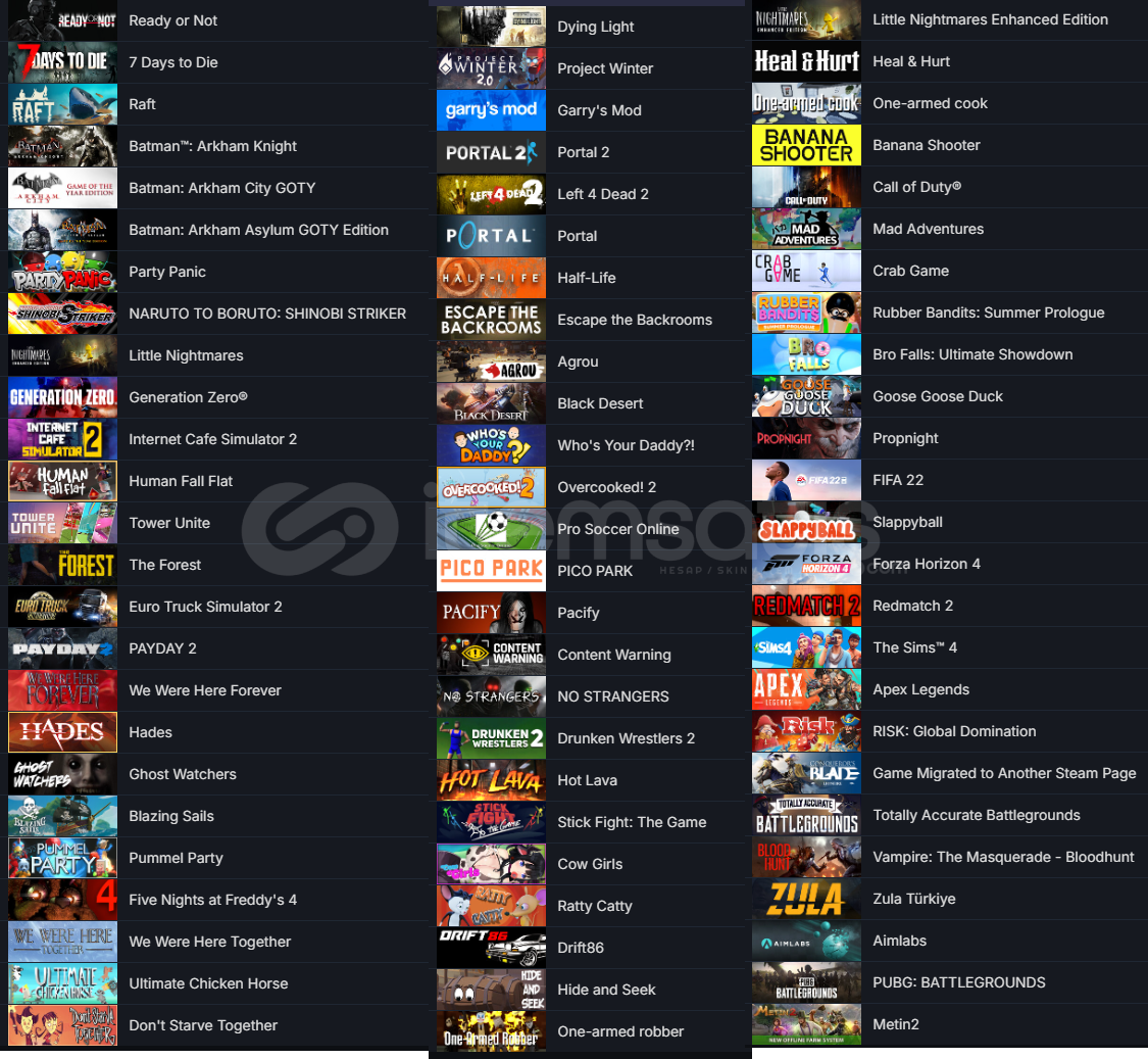 OYUNLAR :CS GO 2 PRİME PUBG PLUS ETS 2 Ready or Not 7 Days to Die Raft Batman™: Arkham Knight Batman: Arkham City GOTY Batman: Arkham Asylum GOTY Edition Party Panic NARUTO TO BORUTO: SHINOBI STRIKER Little Nightmares Generation Zero® Internet Cafe Simulator 2 Human Fall Flat Tower Unite The Forest PAYDAY 2 We Were Here Forever Hades Ghost Watchers Blazing Sails Pummel Party Five Nights at Freddy's 4 We Were Here Together Ultimate Chicken Horse Don't Starve Together