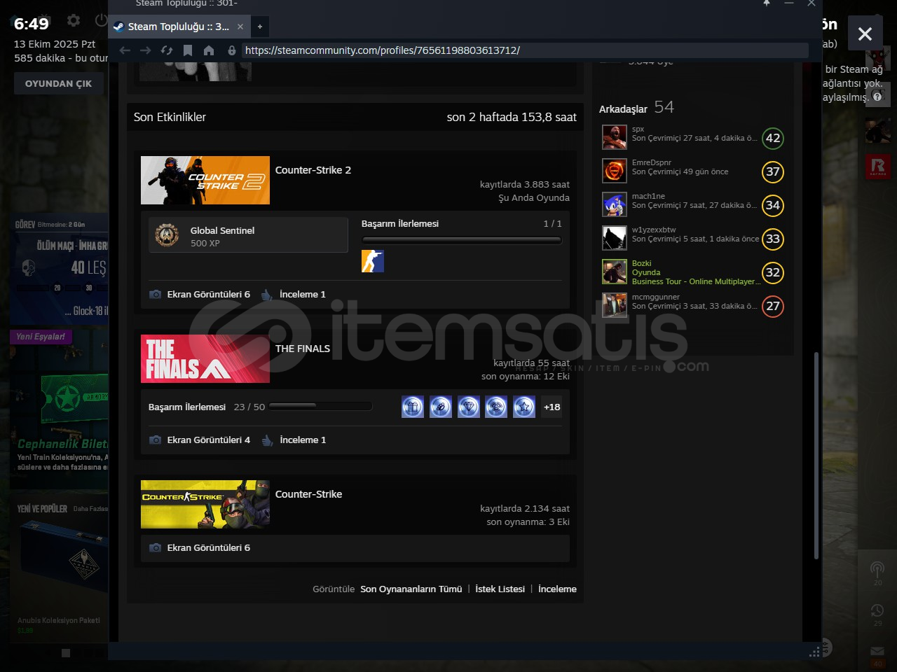 Merhaba dostlar hesabı 2017 den berı kullanıyorum 2 yıl sonra 10.yıl rozetını alacak ıcerısınde envanterle verecegım envanterın degerı 100 200 dolar falandır onun dısında ıcınde oyunlar da var daha cok cs oynadıgım ıcın bu oyunlarla ısım olmadı 24 level olmakla beraber hesapta çerceve hareketlı arka plan ayrıyetten hala kullanılabılecek steam puanı vardır 2000 falandı sanırım onun dısında guven faktorunde hıc bır sıkıntı yoktur tamamen emek hesaptır faceıtı kapanmıştır. her şekılde yardımcı olmaya calısırım sadece hesap teslım edılıp herhangı bır sıkıntı cıkmadıktan sonra pısman olma veya sorumlulugumda olmayan herhangı bır cayma sebebıyle yardımcı olamam bu yazıyla beraber merak etmeyın hesabın guvenlıgı acısından her sekılde yanınızda olacagım bende bır ogrencıyım o yuzden sattıgım ıcın kendımı de guvence altına almaya calısıyorum tesekkur eder hayırlı alısverısler dılerım.