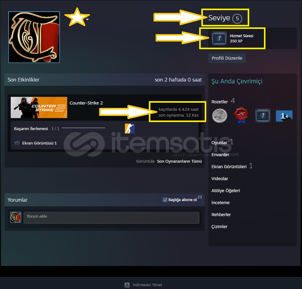 + Otomatik Teslimat Bekleme Süresi Yaşamadan Online Olmamızı Beklemeden+ Ürününüzü Satın Aldığınız An itibari-ile Bilgiler Sizlere Otomatik Gönderilecektir.-----Hesap Bilgileri-----+ Prime & Seçkin+ 4,260 Saat CS:GO Oynama Süresi+ 7 Yıllık Hesap+ Güven Faktörü: Yeşil+ CS:GO Seviyesi : 6+ Steam Seviyesi : 5-----Madalya Bilgileri-----1 : Sadakat Rozeti2 : Elmas Kırık Di...